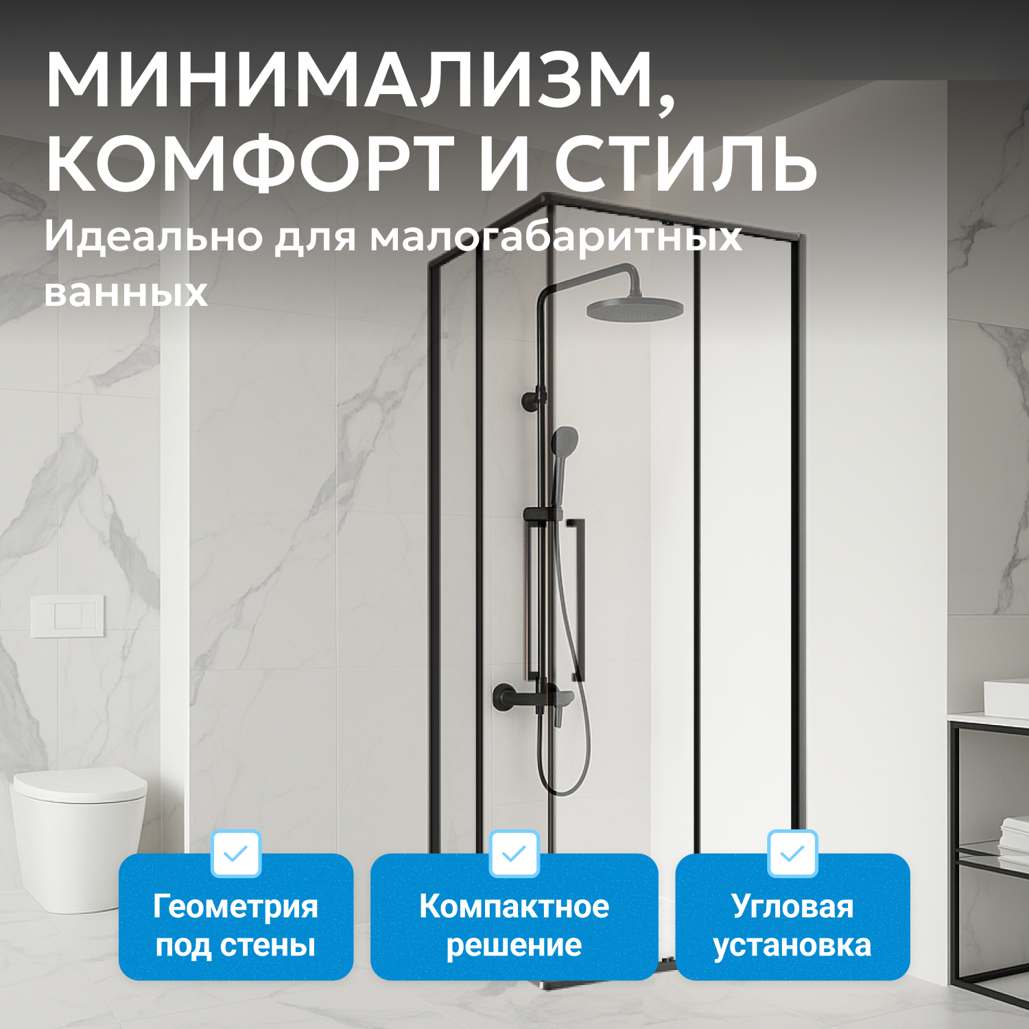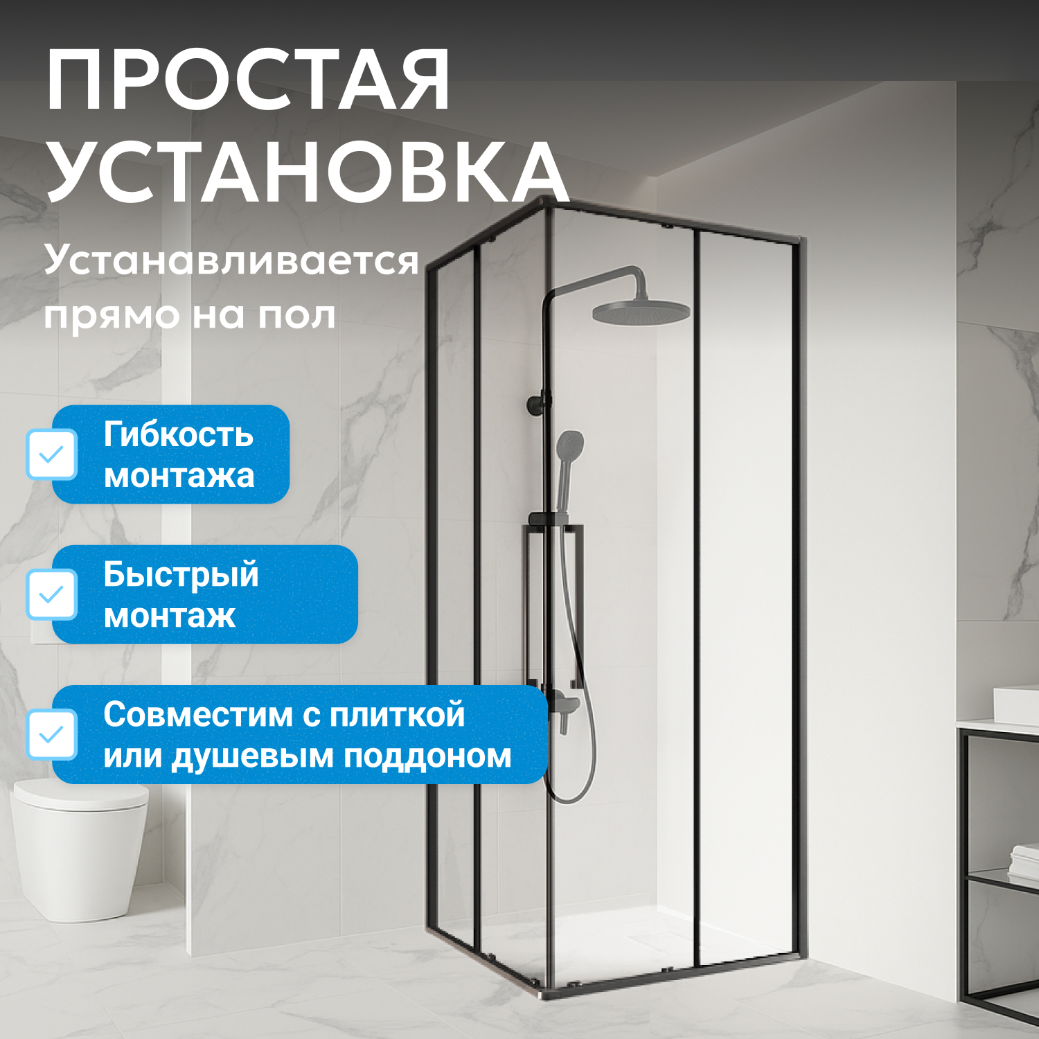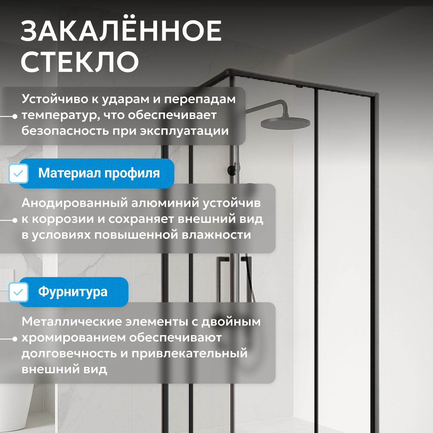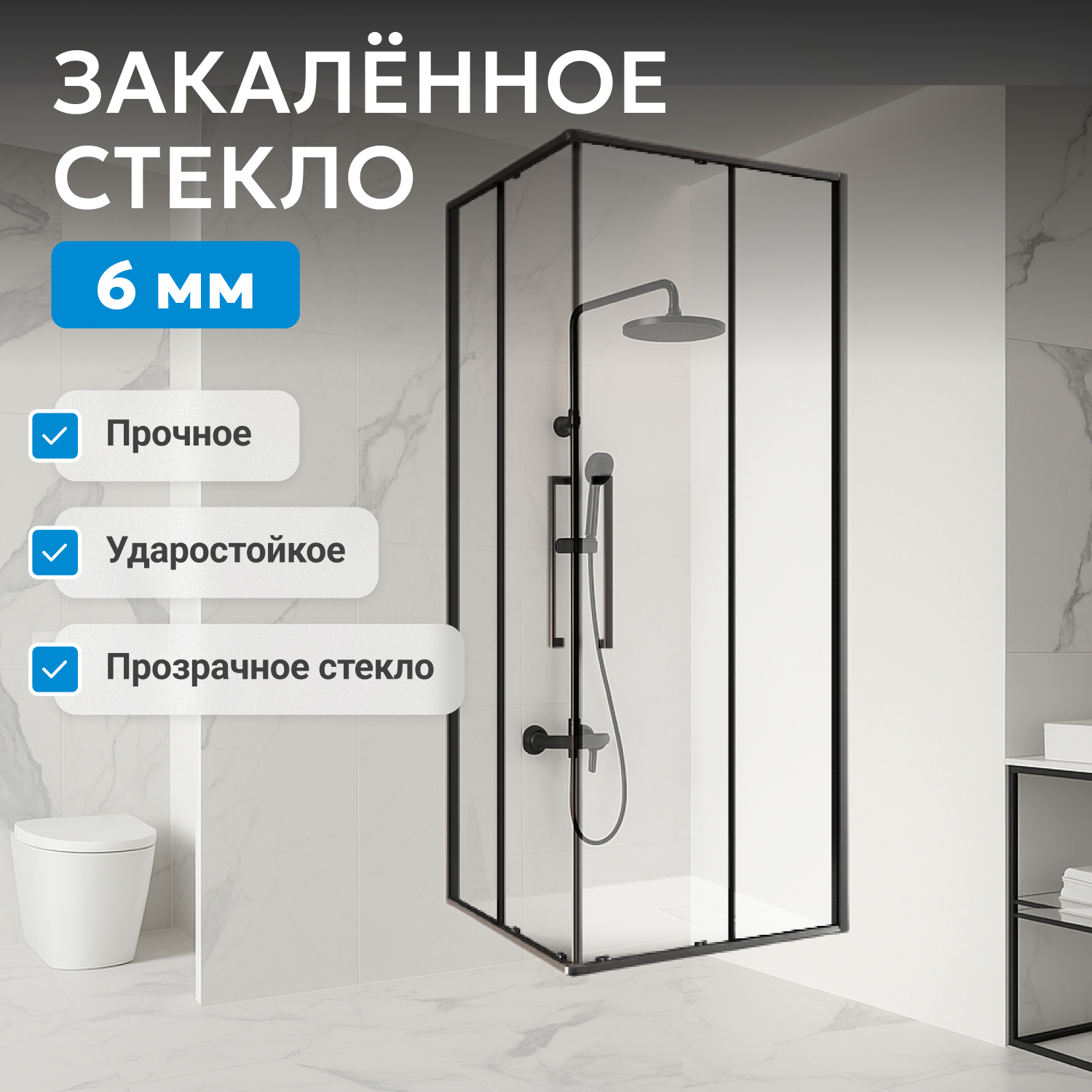 Стеклянные панели из 6 мм прозрачного закаленного стекла обеспечивают визуальную легкость конструкции и необходимый уровень безопасности. Прочная фурнитура и двойные ролики на дверях гарантируют плавный ход и долговечность механизма. Раздвижная система экономит пространство, а ширина входа 507 мм обеспечивает комфортное пользование уголком. Установка в угол практична для стандартных планировок.