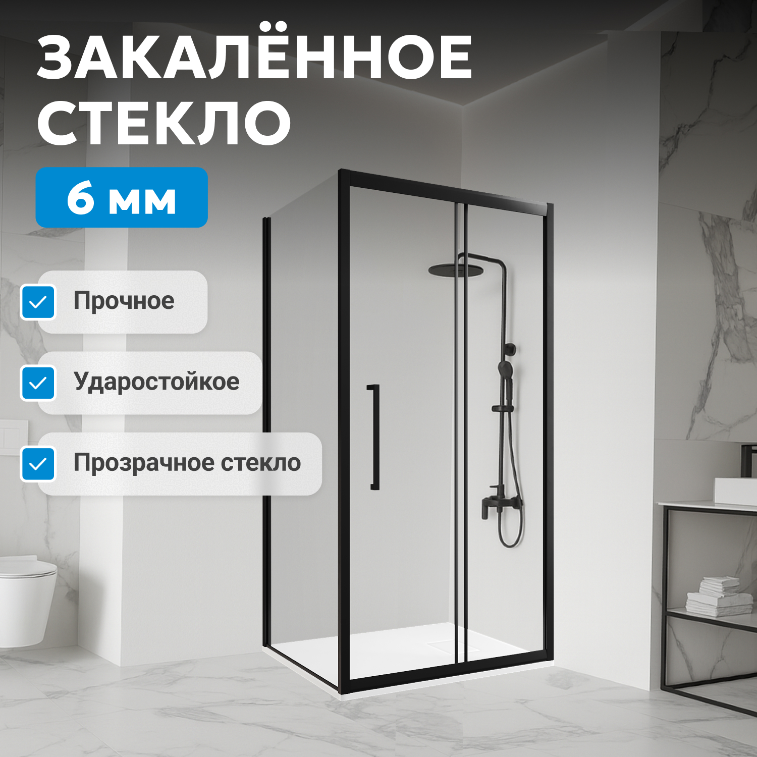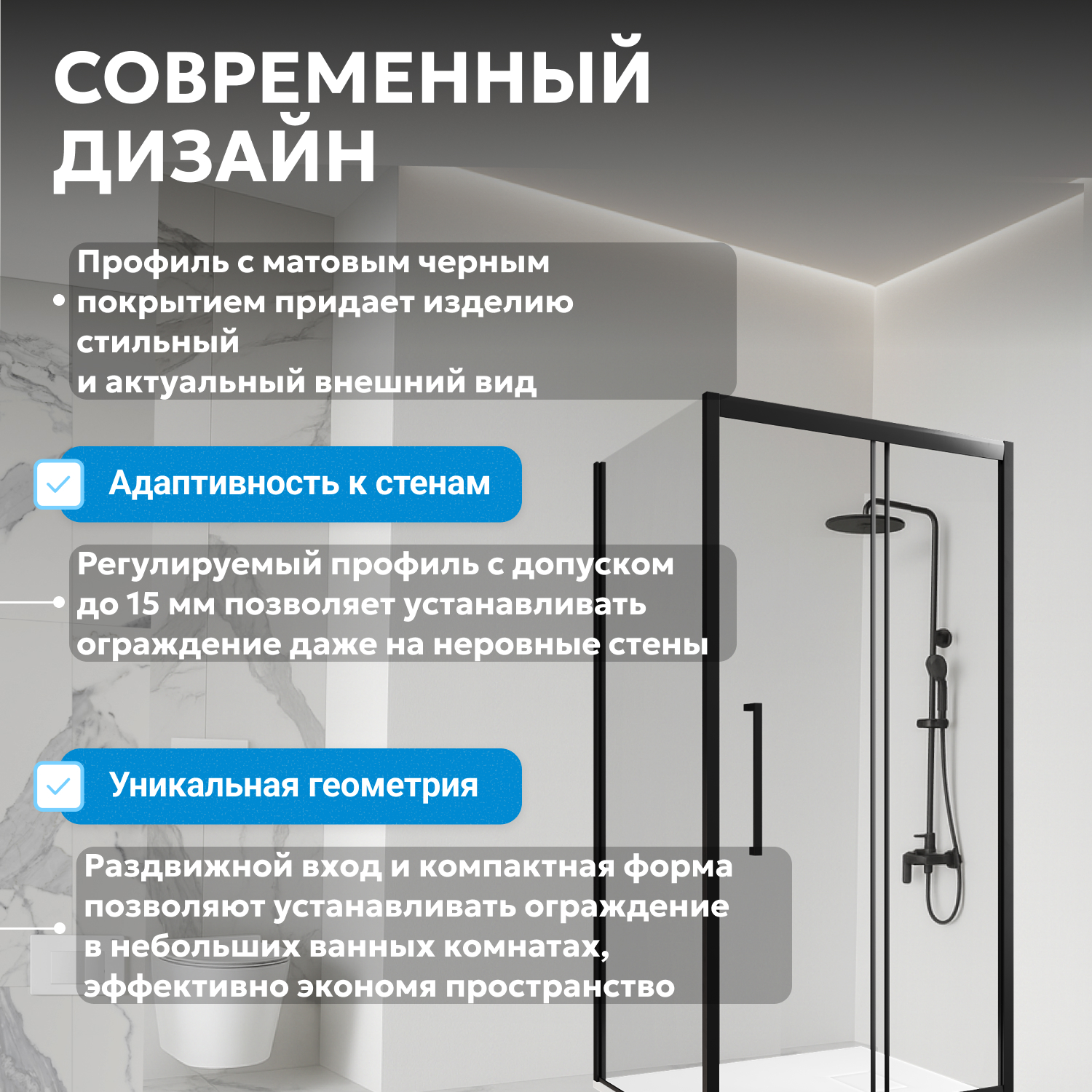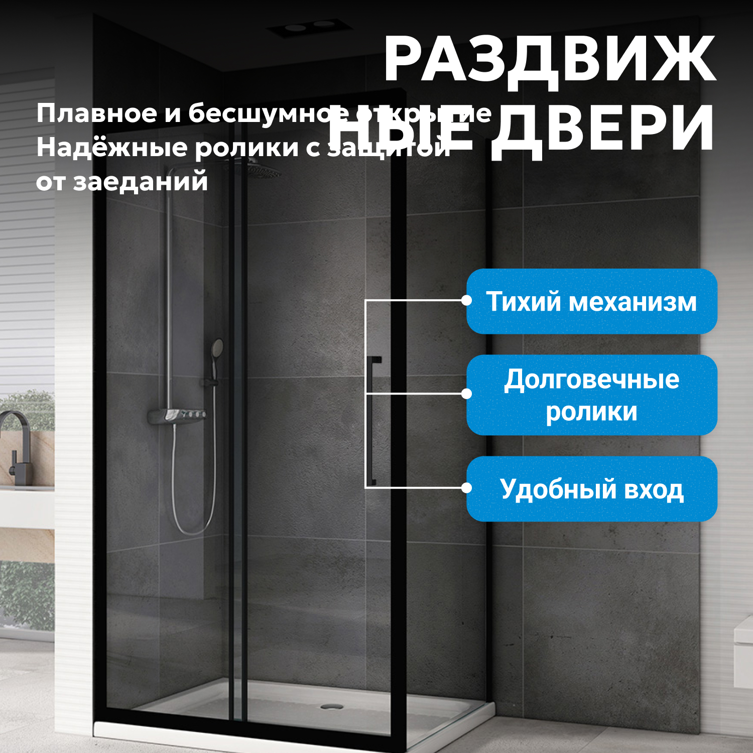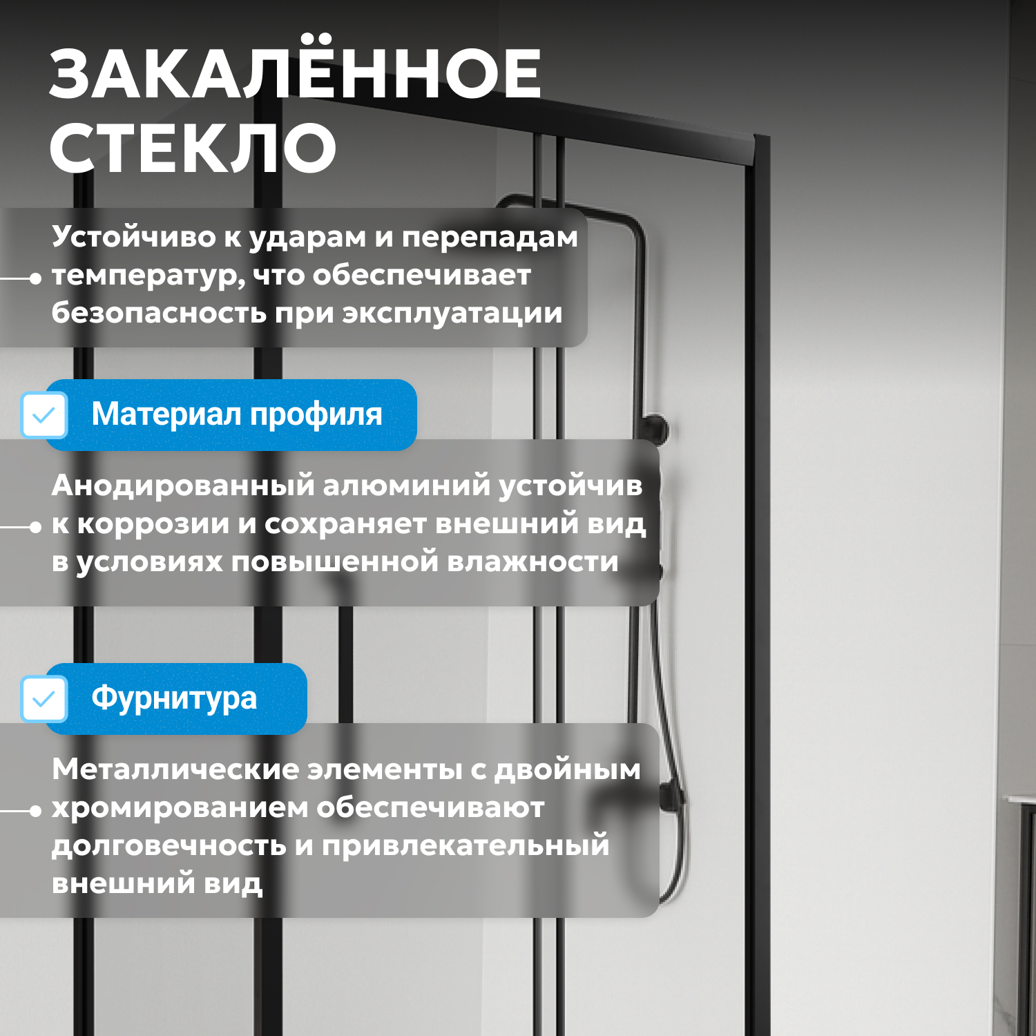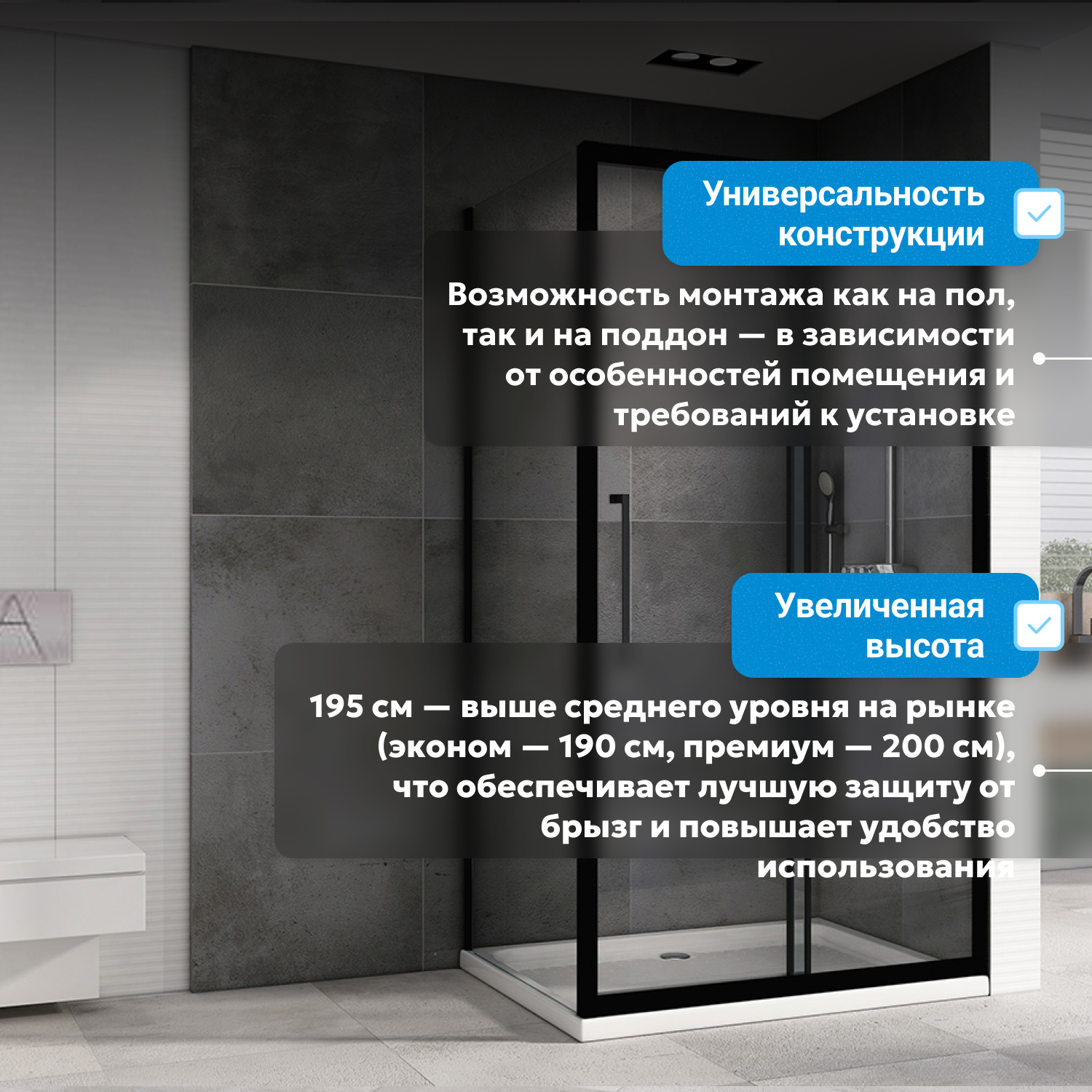 В конструкции применяются двойные ролики для плавного и долговечного открывания дверей. Увеличенные металлические ручки удобны в эксплуатации и подчеркивают современный стиль. Высота изделия — 195 см, подходит для пользователей любого роста. Универсальная модификация упрощает монтаж, не требуя сложных подготовительных работ. Модель поставляется без поддона, что позволяет подобрать подходящий по индивидуальным предпочтениям.