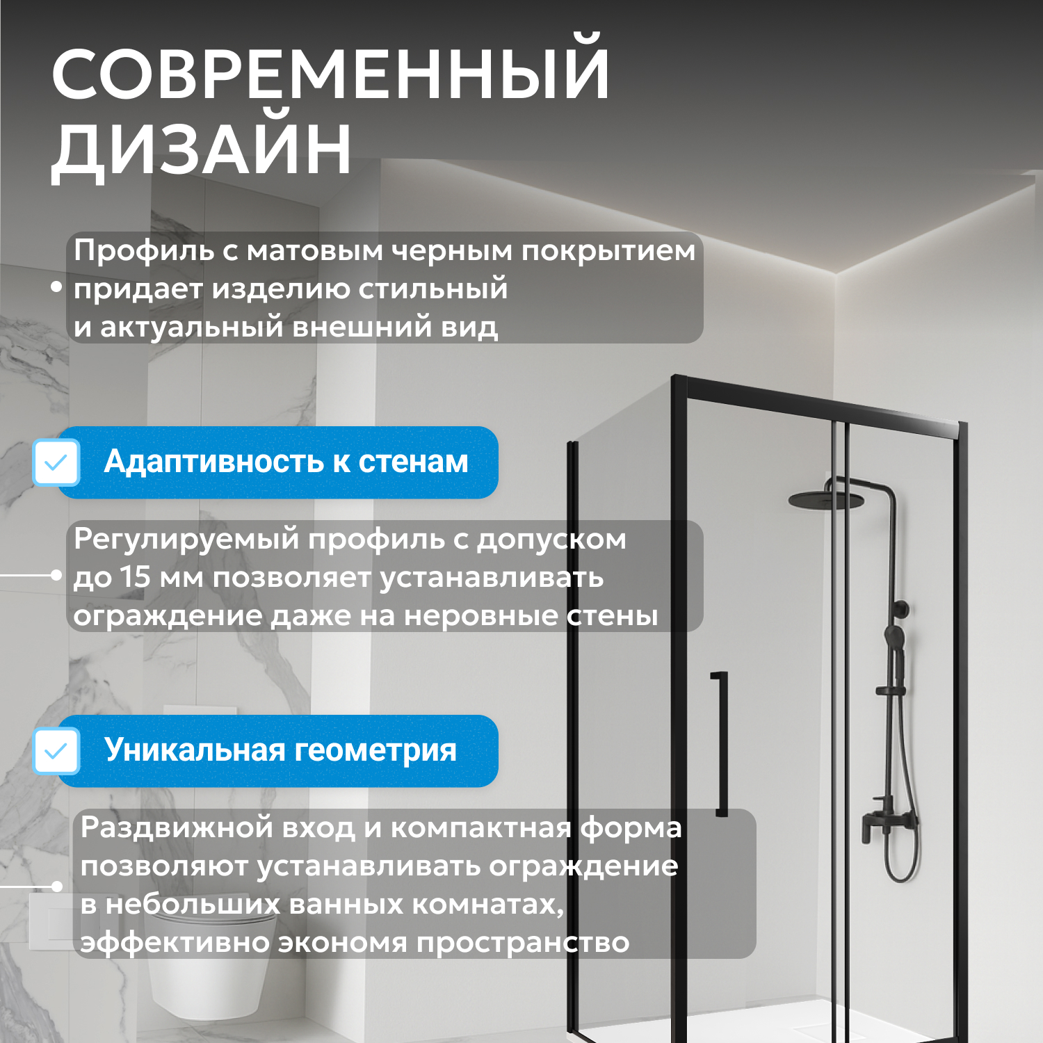 Одна раздвижная дверь обеспечивает свободный доступ даже в небольших помещениях, система двойных роликов гарантирует плавный и тихий ход двери. Для установки требуется низкий поддон (приобретается отдельно). Универсальная конструкция подходит для большинства стандартных ванных комнат.