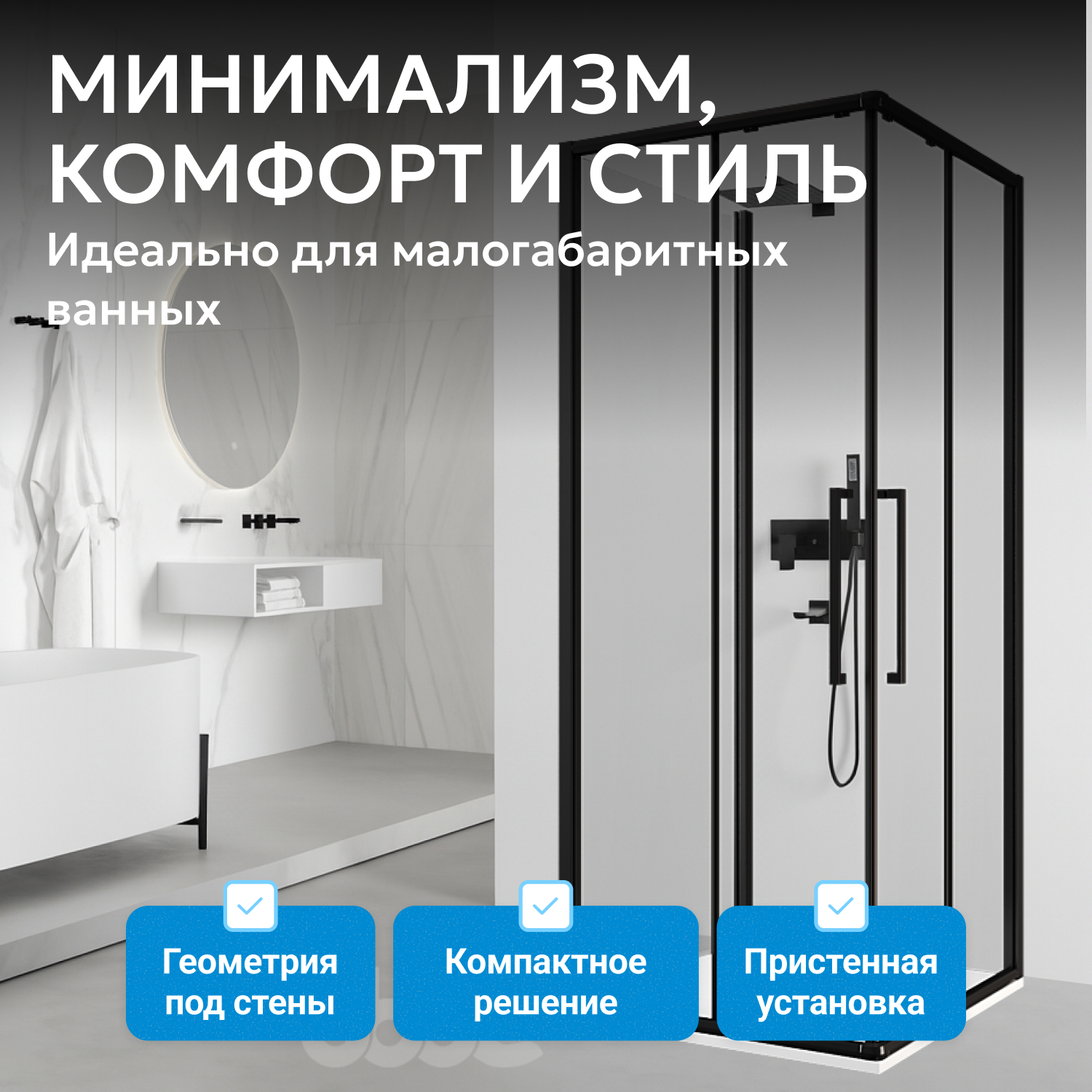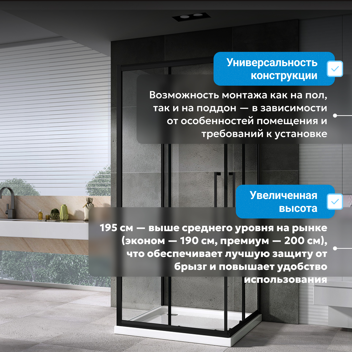 Монтаж осуществляется пристенным способом с надежной фиксацией и герметичностью. Две раздвижные двери на двойных роликах открываются плавно и тихо, увеличенные металлические ручки обеспечивают удобство. Ширина входа — 437 мм. Поддон не входит в комплект, приобретается отдельно, что позволяет выбрать подходящий по параметрам вариант.
