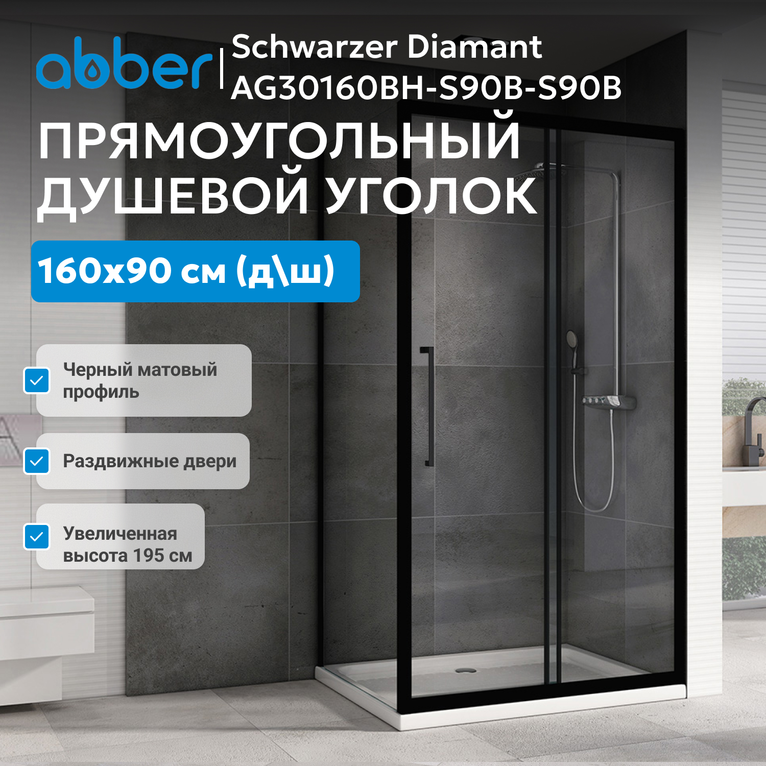 Душевой уголок ABBER Schwarzer Diamant AG30160BH-S90B-S90B подходит для современных ванных, совмещая надежность, удобство эксплуатации и стильный дизайн.