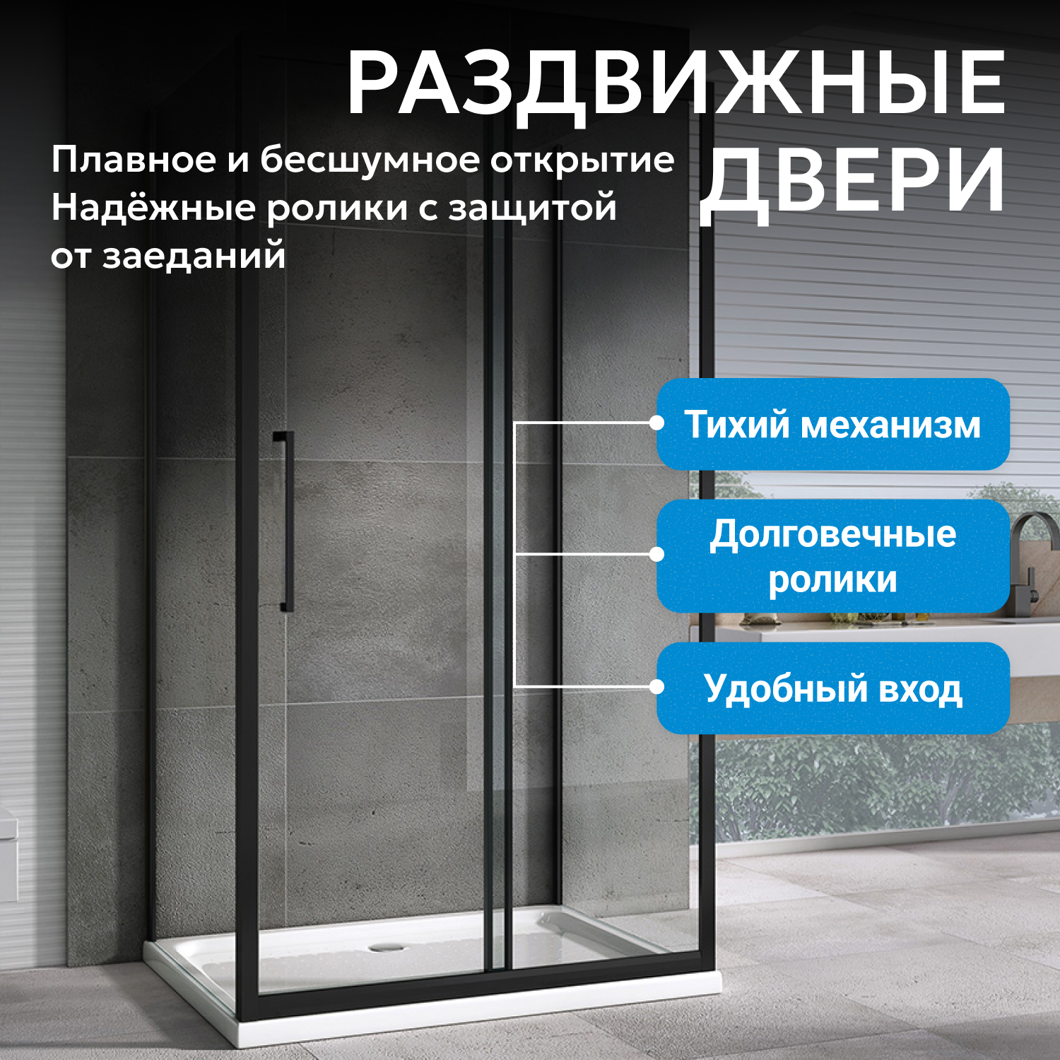 Модель выполнена из прозрачного закаленного стекла толщиной 6 мм. Прямоугольная форма и черный профиль создают современный внешний вид. Раздвижная дверная конструкция с одной дверью экономит место, обеспечивая простой доступ при ширине входа 698 мм. Металлические ручки и двойные ролики повышают надежность и долговечность. Уголок рассчитан на пристенный монтаж и может устанавливаться как слева, так и справа для удобства в разных помещениях.