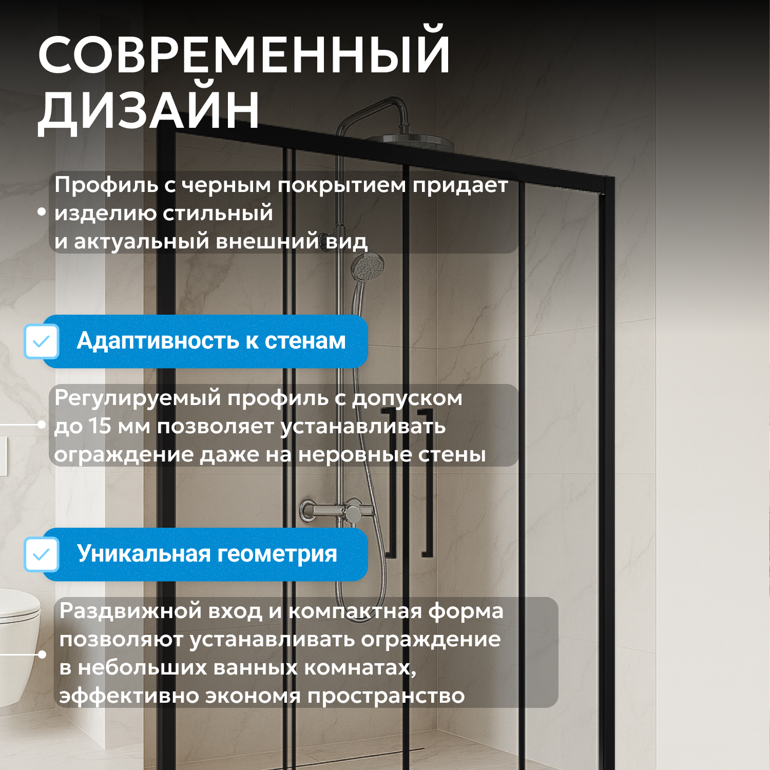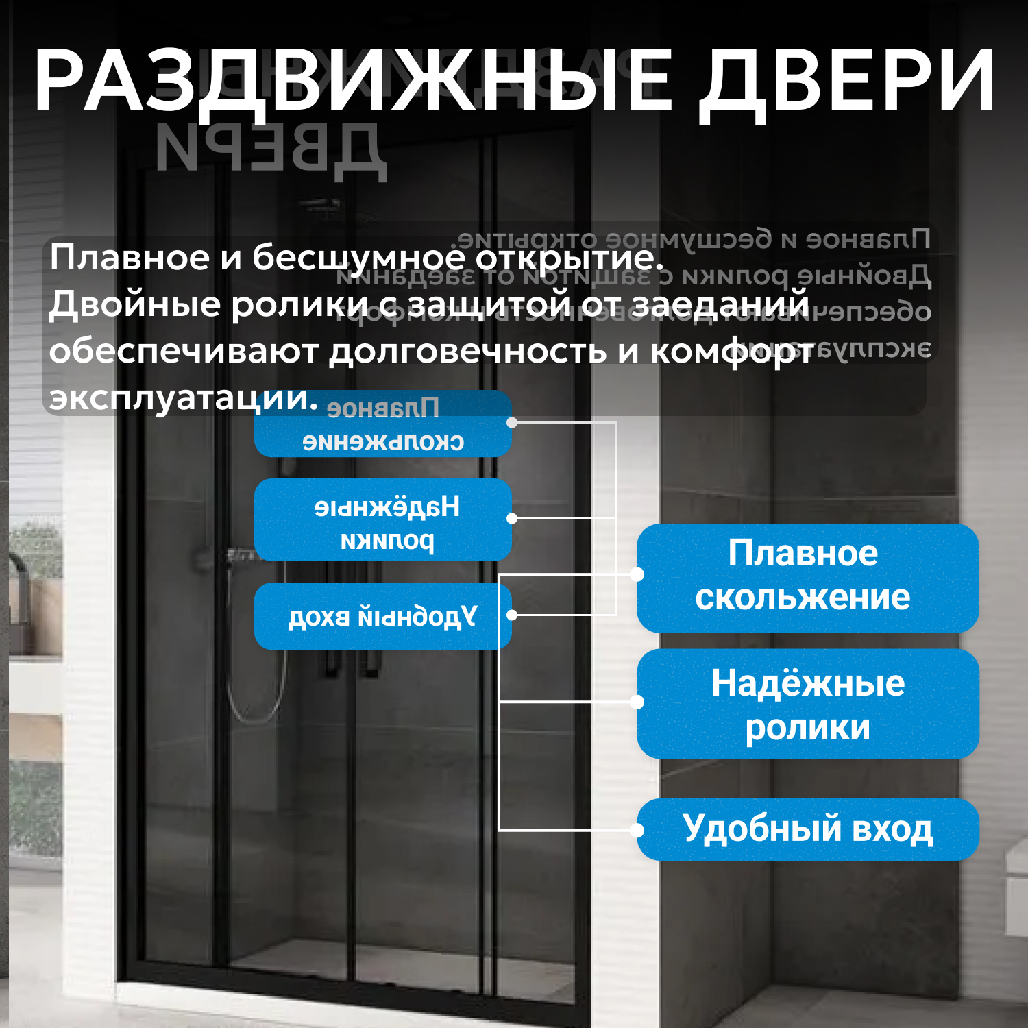 Душевые двери ABBER изготавливаются из алюминиевого профиля, окрашенного порошковой краской и закалённого, ударопрочного стекла. Также стеклянные душевые двери обладают рядом преимуществ: они легко моются, надежны и долговечны в эксплуатации.