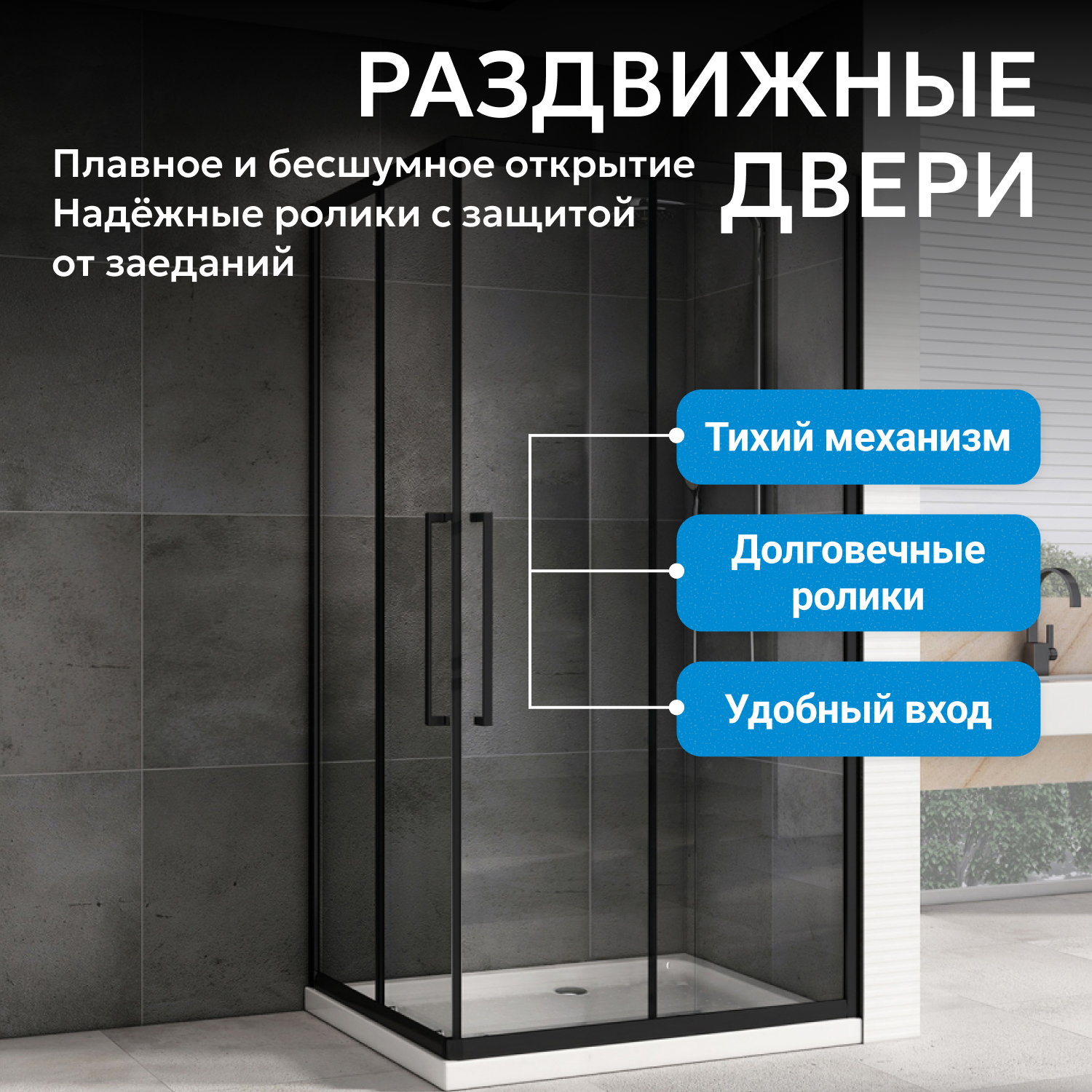Раздвижная система дверей на двойных роликах обеспечивает плавное открывание двух створок и экономит пространство. Ширина входа 610 мм удобна для ежедневного использования всей семьей. Низкий поддон облегчает проход, при этом поддон приобретается отдельно. Высота конструкции — 195 см, что подходит для стандартных потолков.