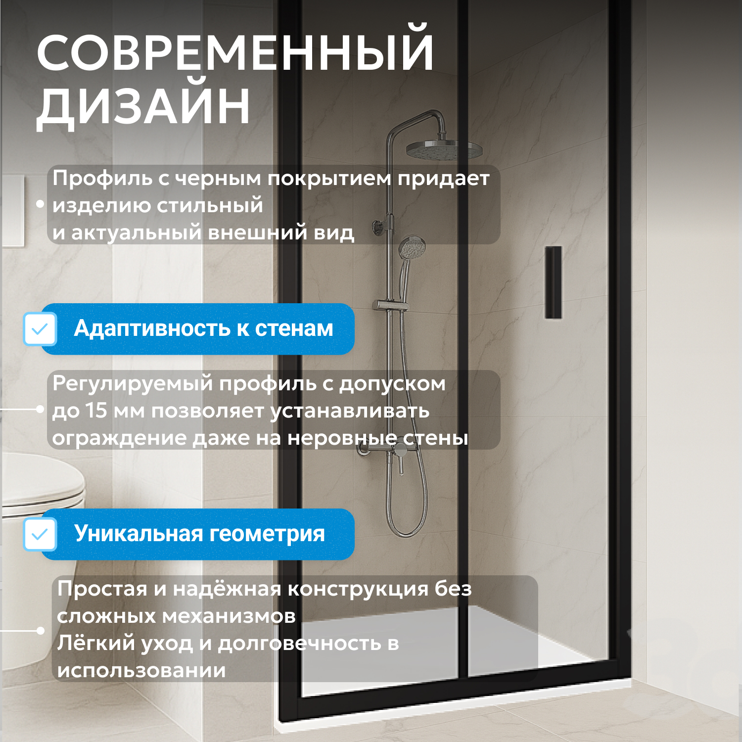 Душевые двери ABBER изготавливаются из алюминиевого профиля, окрашенного порошковой краской и закалённого, ударопрочного стекла. Также стеклянные душевые двери обладают рядом преимуществ: они легко моются, надежны и долговечны в эксплуатации.