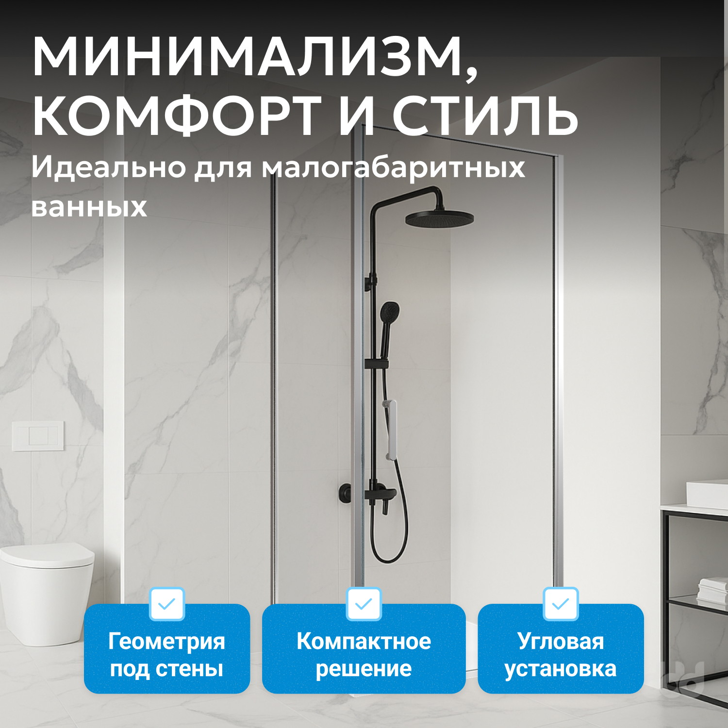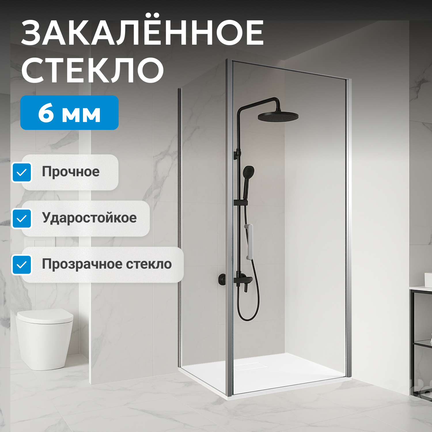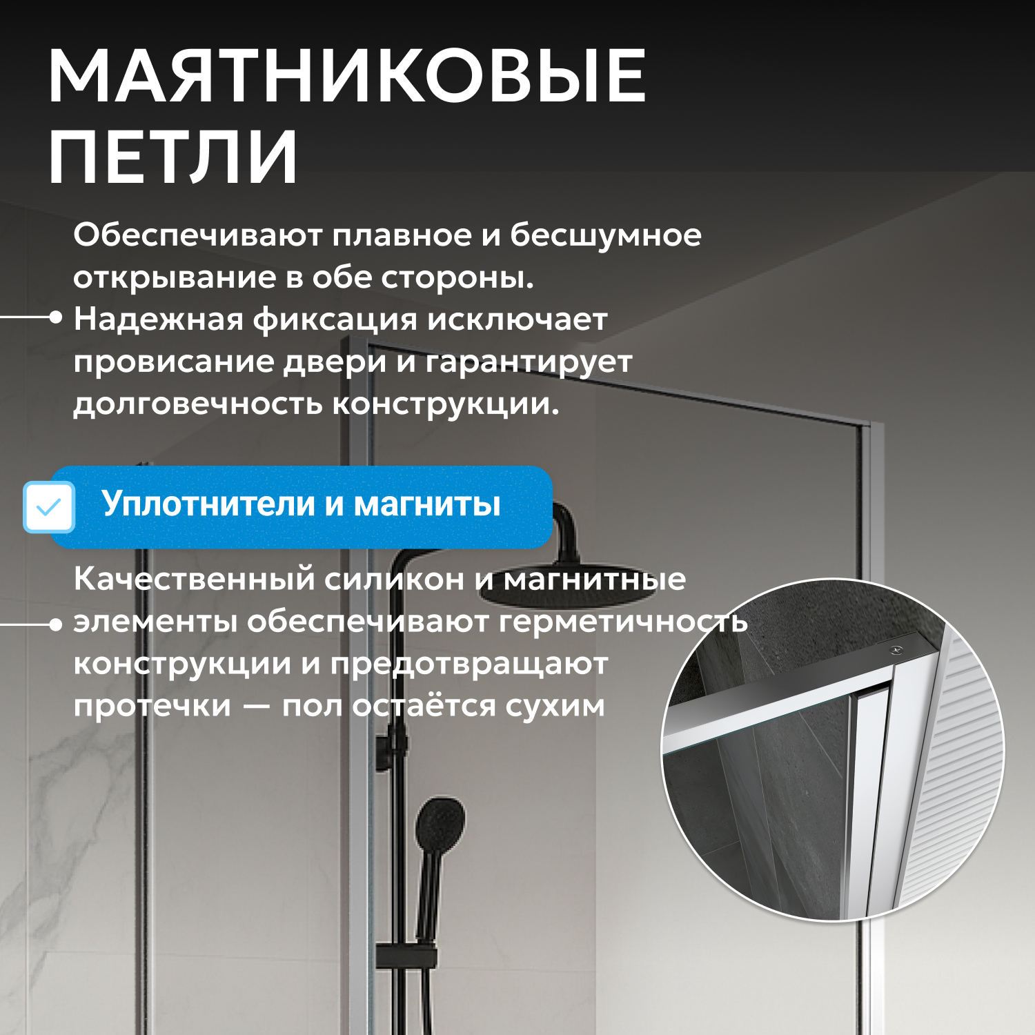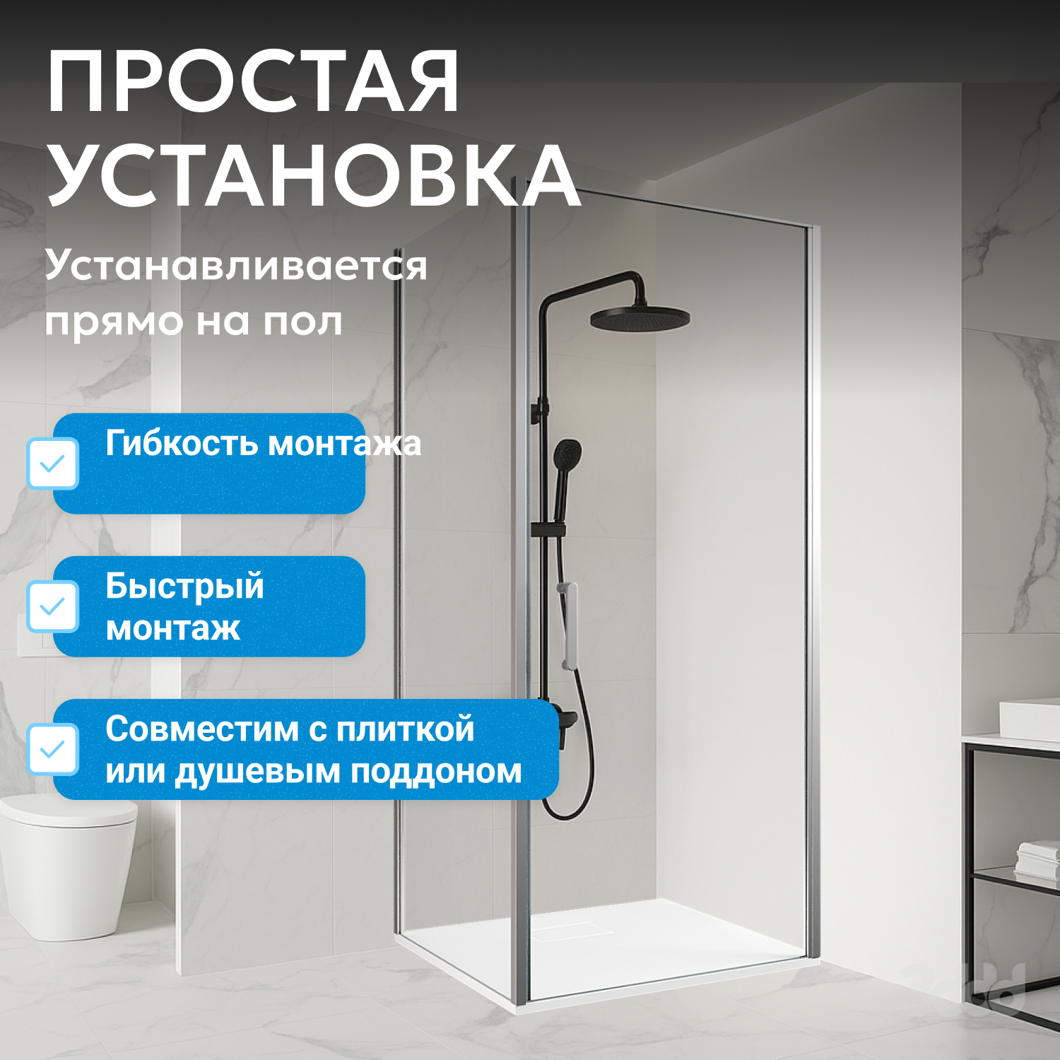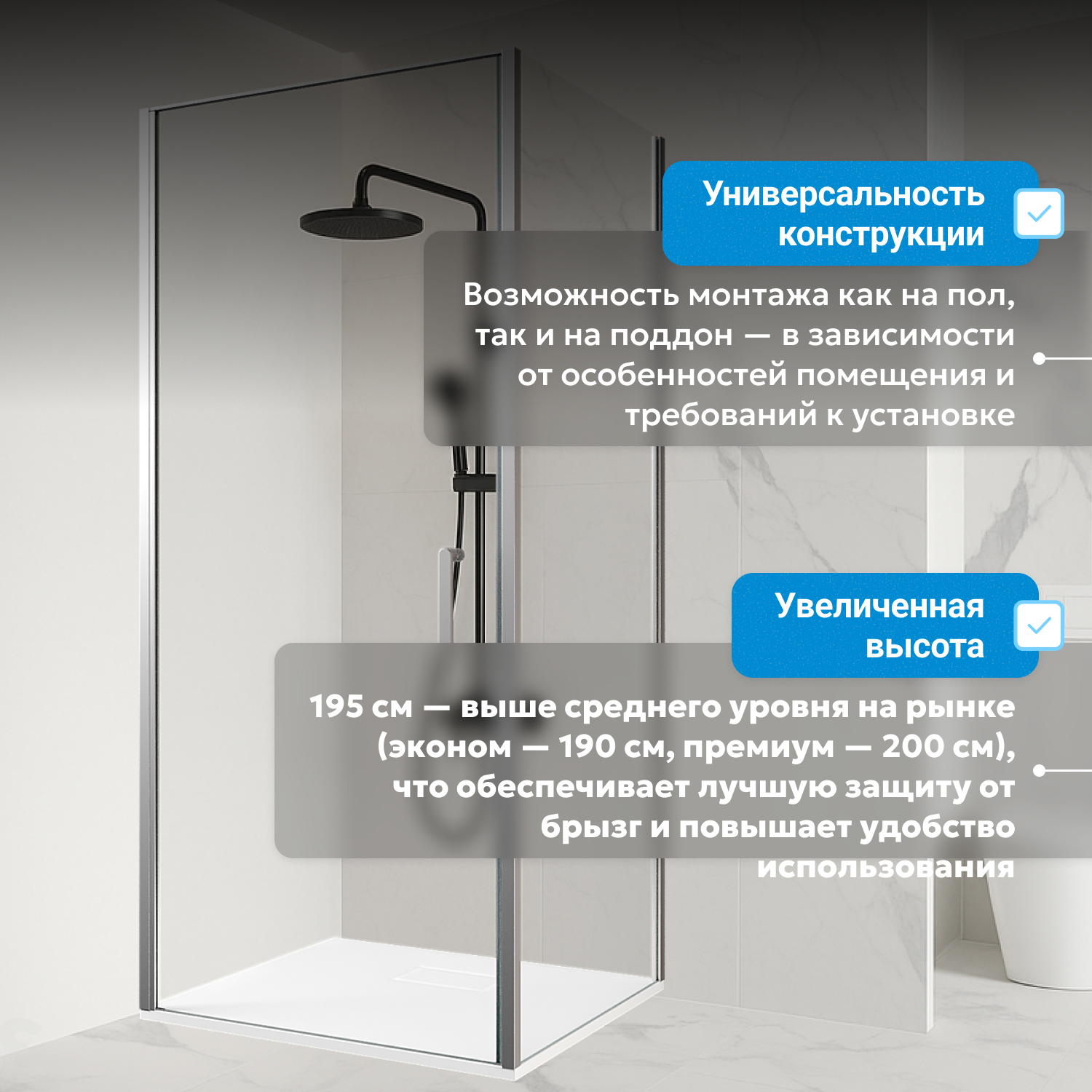 Квадратная форма (80х80 см) облегчает монтаж и обеспечивает совместимость с распространёнными поддонами. Модель относится к универсальным душевым уголкам и подходит для большинства стандартных санузлов. Официальная гарантия от производителя — 3 года.