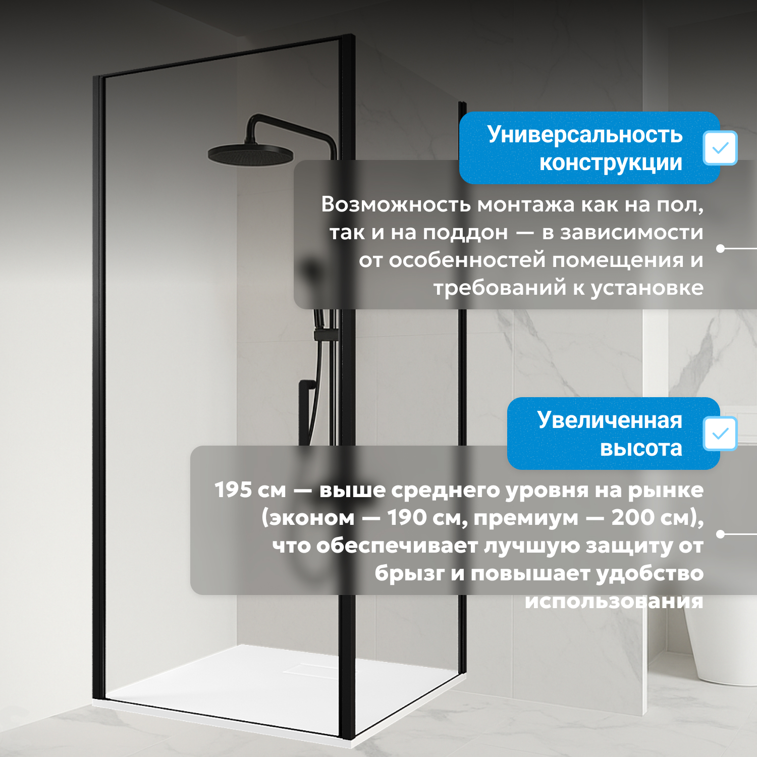 Модель поставляется без поддона, что даёт возможность выбрать подходящее решение для вашего интерьера. Металлическая ручка соответствует современному стилю и обеспечивает комфорт при использовании. Высота уголка — 195 см, подходящая для большинства ванных комнат.