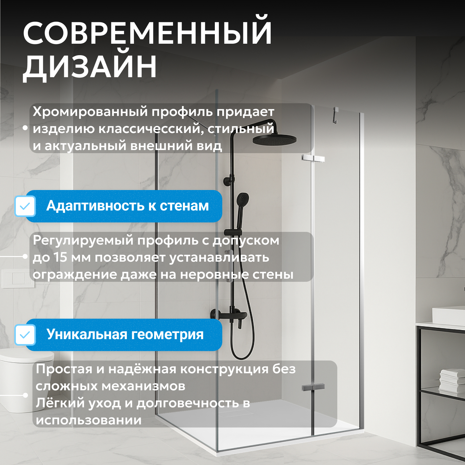 ABBER Zart AG08120-S101 выбирают за современный дизайн, безопасное закалённое стекло, лаконичный профиль, универсальность монтажа, надёжные комплектующие и российскую сервисную поддержку. Модель сочетает долговечность, качество и удобство эксплуатации.