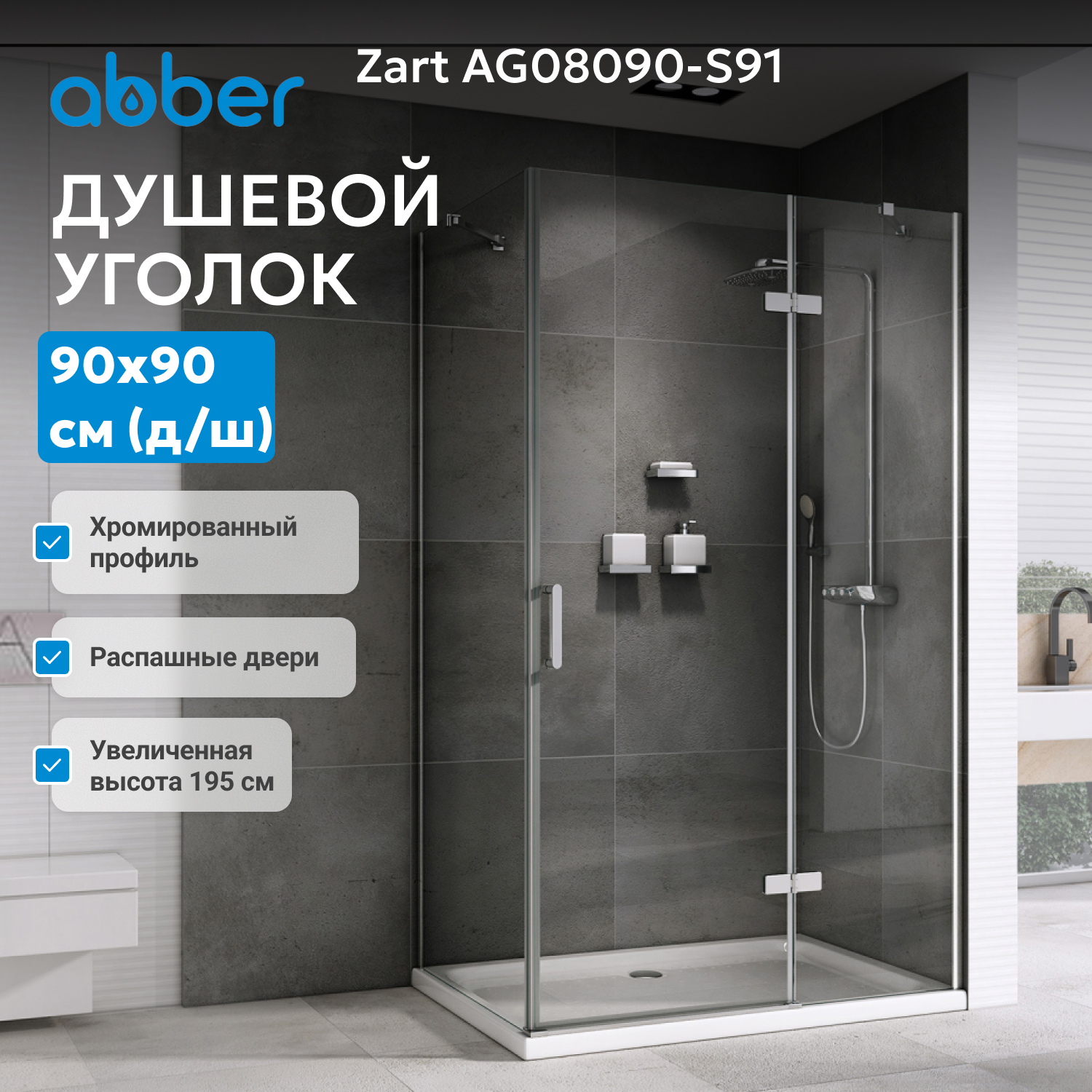 Душевой уголок ABBER Zart AG08090-S91 сочетает минималистичный дизайн с немецкими стандартами качества. Квадратная форма, прозрачные 6-миллиметровые стеклянные стенки и хромированный профиль подходят для современных ванных комнат. Металлическая ручка, латунные кронштейны и петли обеспечивают надежность конструкции при интенсивном использовании.