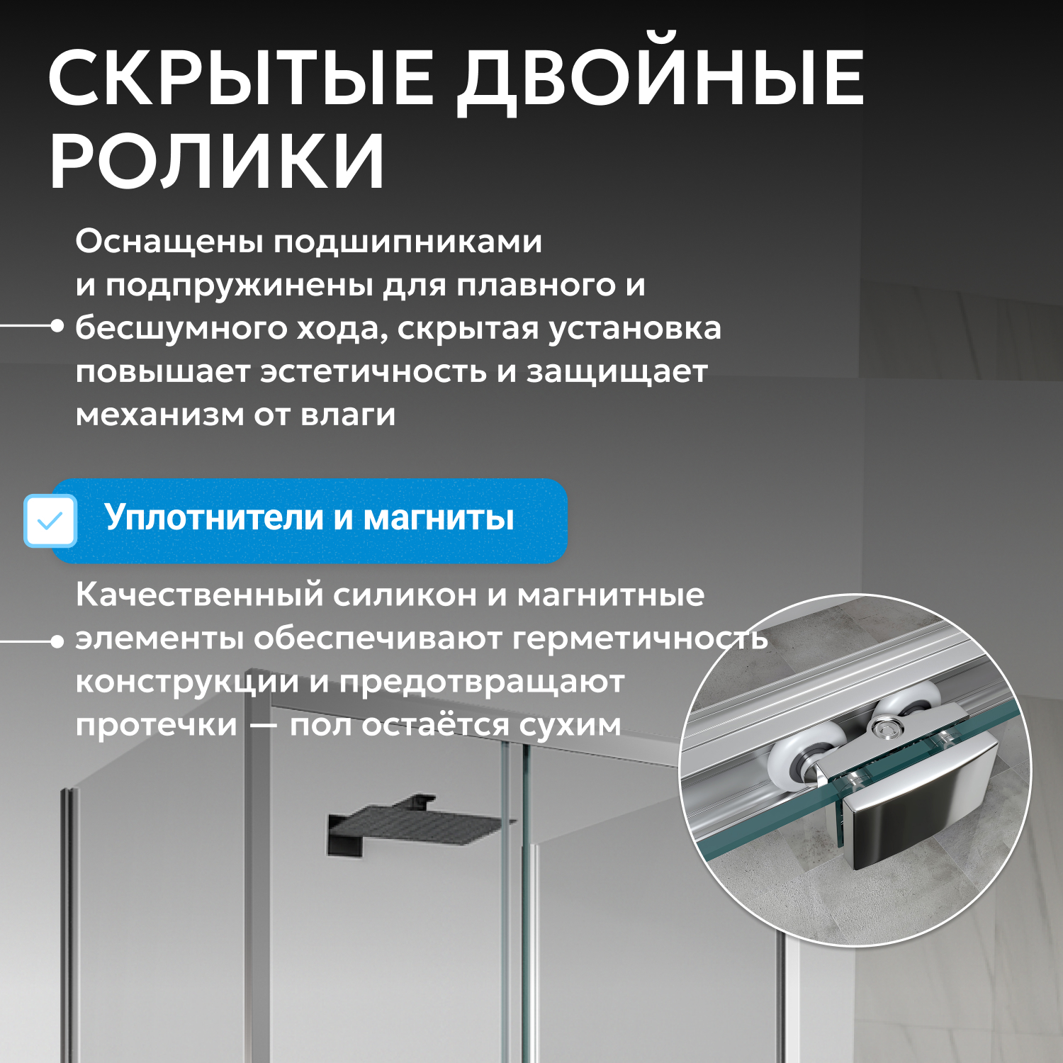 Конструкция с одной раздвижной дверью на двойных роликах гарантирует плавный ход и легкий доступ. Большая металлическая ручка повышает удобство использования. Монтаж оптимизирован для пристенного размещения, а поддон можно подобрать отдельно, рекомендуется низкий тип для простоты обслуживания.