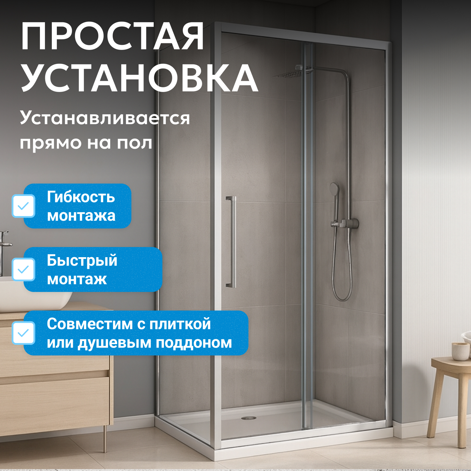 В комплектации отсутствуют доводчики, что положительно влияет на срок службы. Модель без поддона дает свободу при выборе подходящего варианта отдельно. Размер 100x100 см способствует эффективному использованию пространства, ширина входа 398 мм обеспечивает удобный доступ в ограниченных условиях.