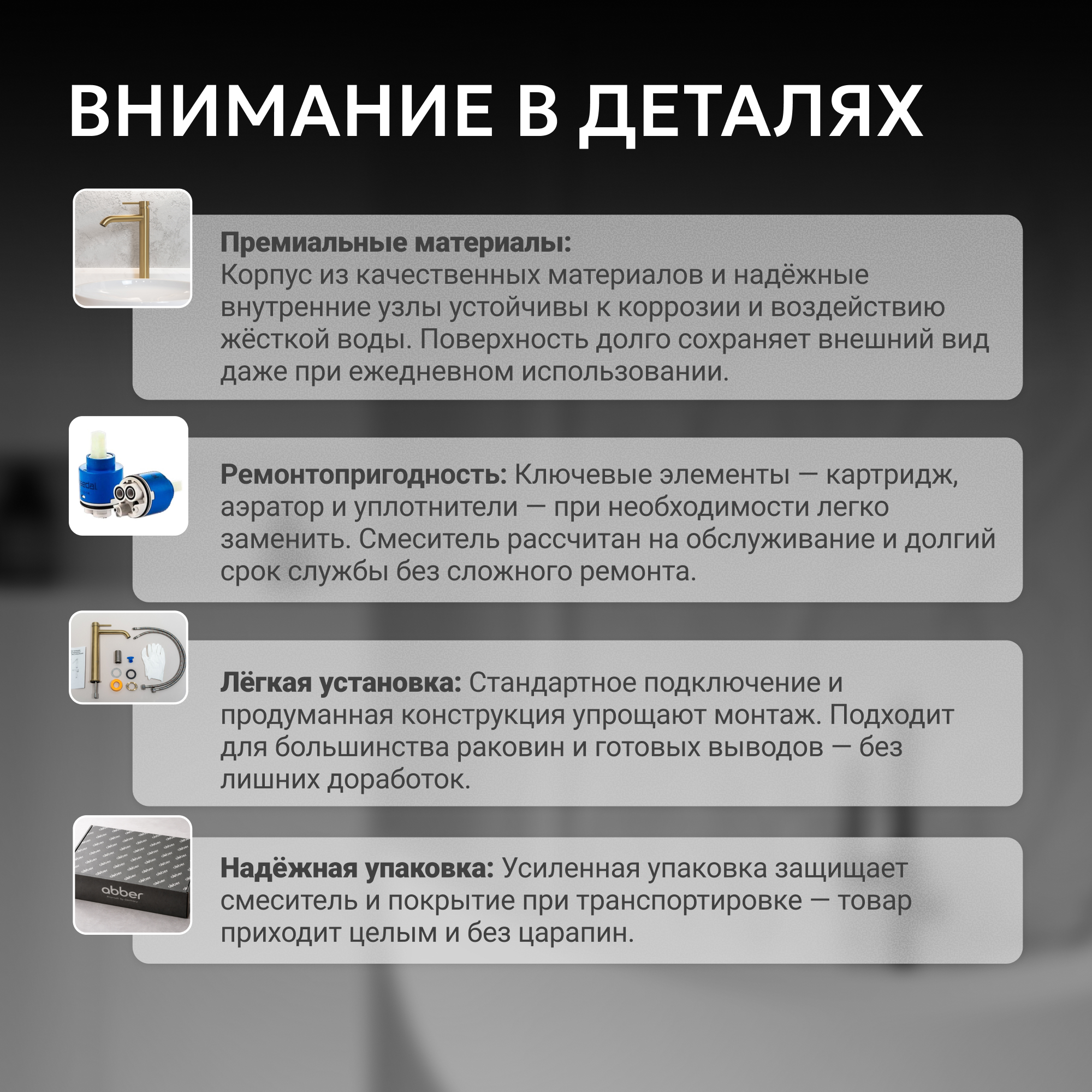Корпус всех смесителей ABBER изготавливается из латуни техникой цельной отливки при атмосферном давлении, что обеспечивает высокую прочность изделия и устойчивость к перепадам давления.