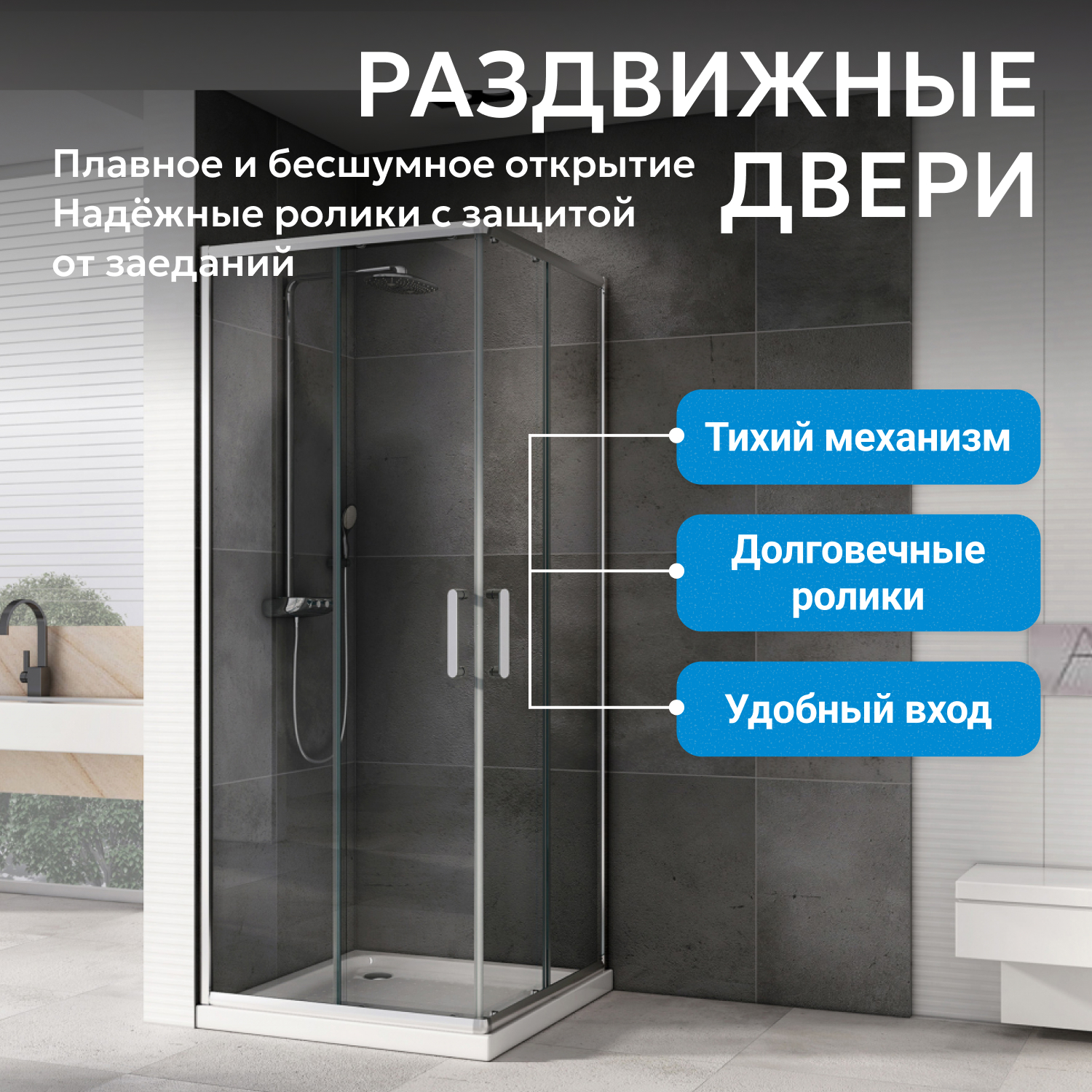 Профиль выполнен в хромированном цвете, что упрощает уход и гармонирует с современными интерьерами. Закалённое прозрачное стекло толщиной 5 мм обеспечивает безопасность и визуально увеличивает пространство. Гарантия производителя — 3 года.
