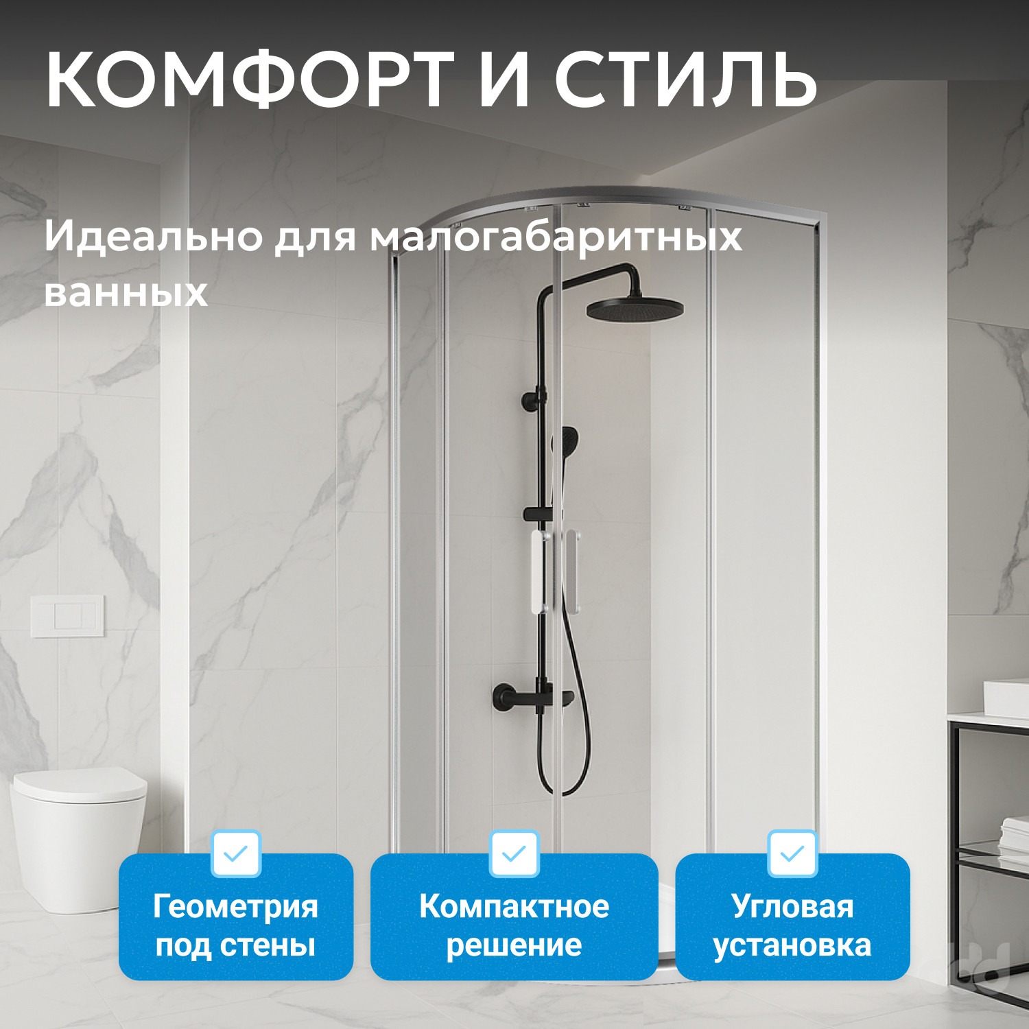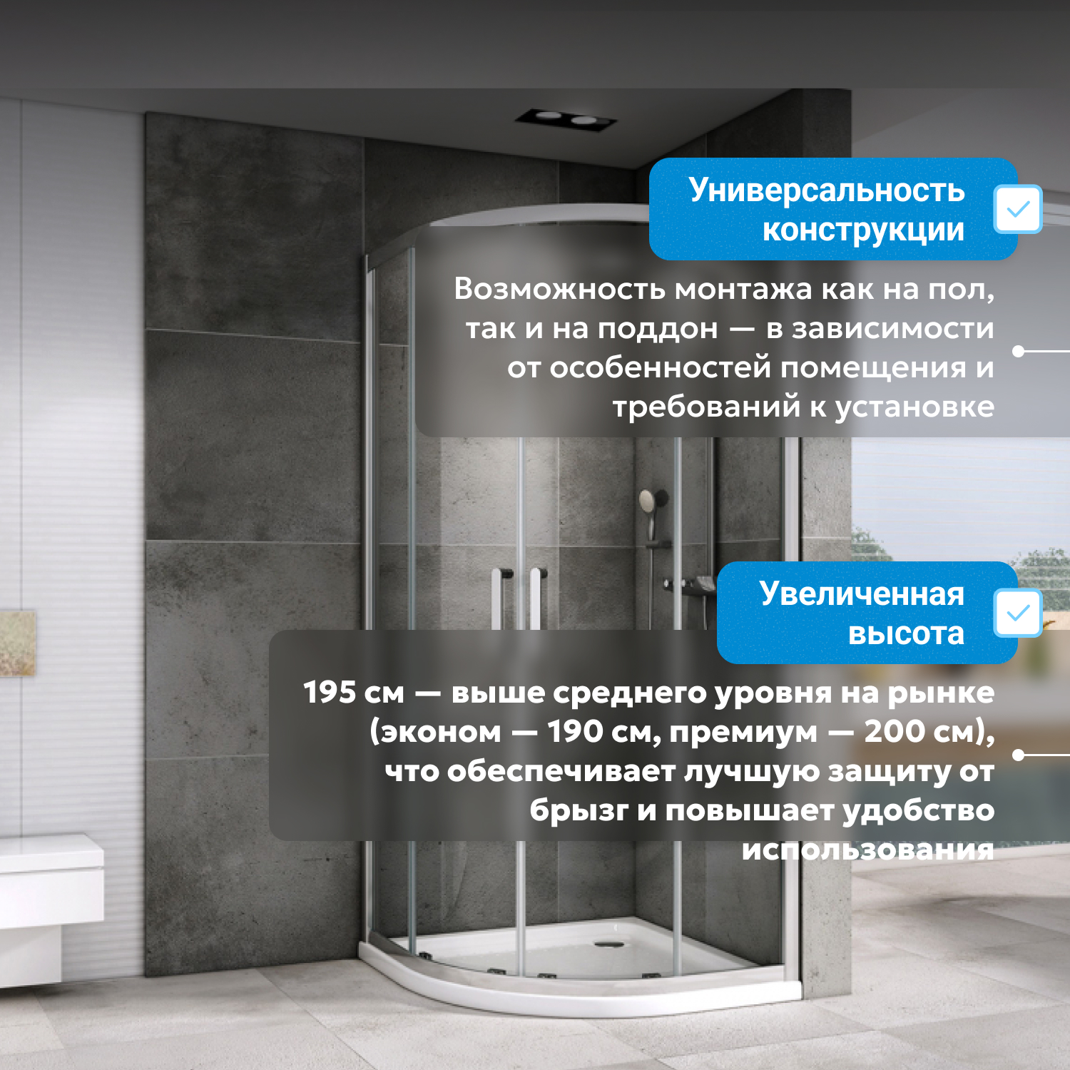 Размеры 90х90 см, высота 195 см подходят для большинства планировок. Универсальная конфигурация позволяет устанавливать уголок с левым или правым входом, расширяя варианты размещения. Прозрачное стекло и хромированный профиль гармонично вписываются в современные и классические интерьеры.