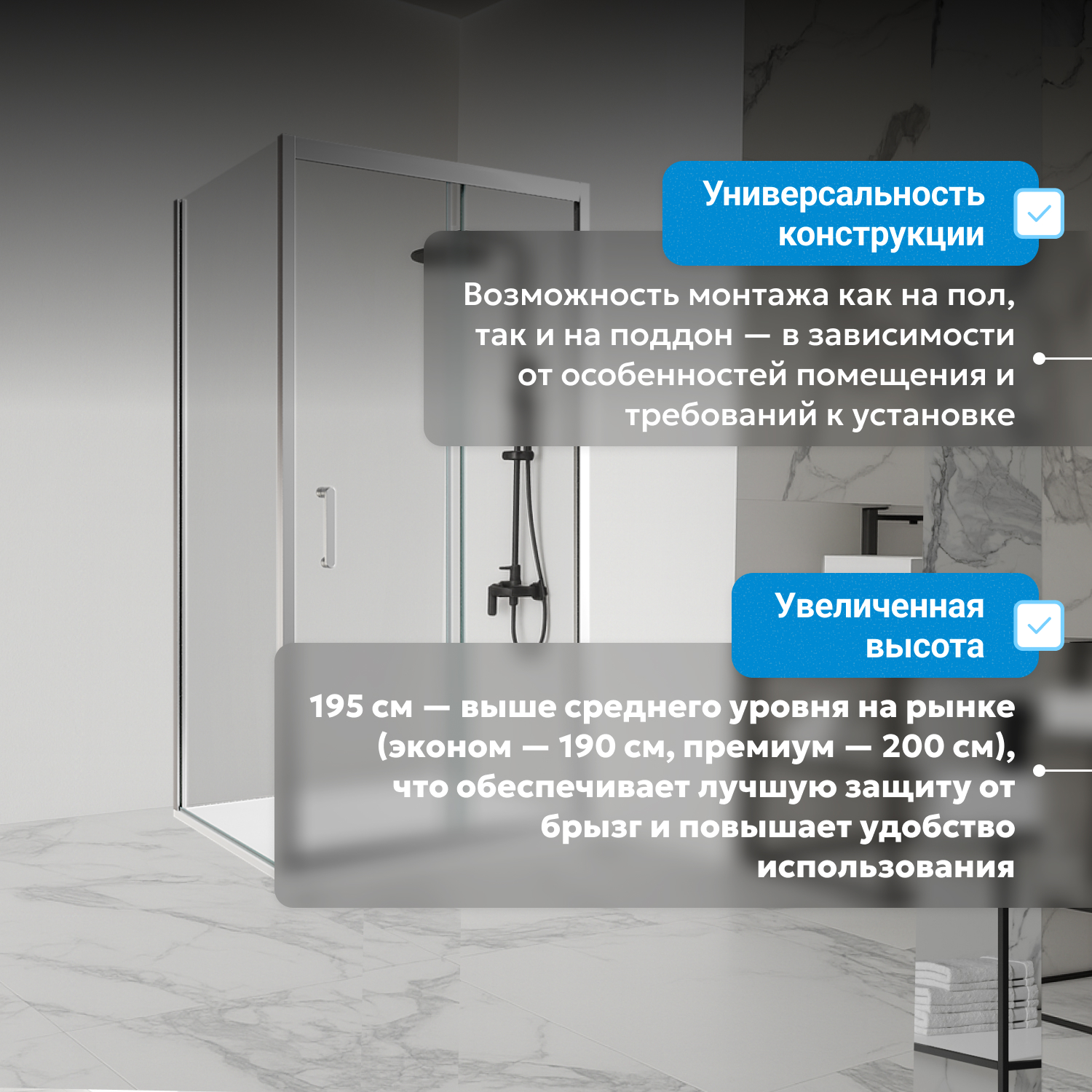 Универсальная модификация позволяет выбрать низкий поддон (приобретается отдельно). Прочная алюминиевая рамка с хромированным профилем устойчива к коррозии и не требует специального ухода. В конструкции отсутствуют водоотталкивающее покрытие и доводчики, что упрощает обслуживание и снижает затраты эксплуатации. Оцинкованный профиль и надёжные монтажные элементы обеспечивают безопасность использования.