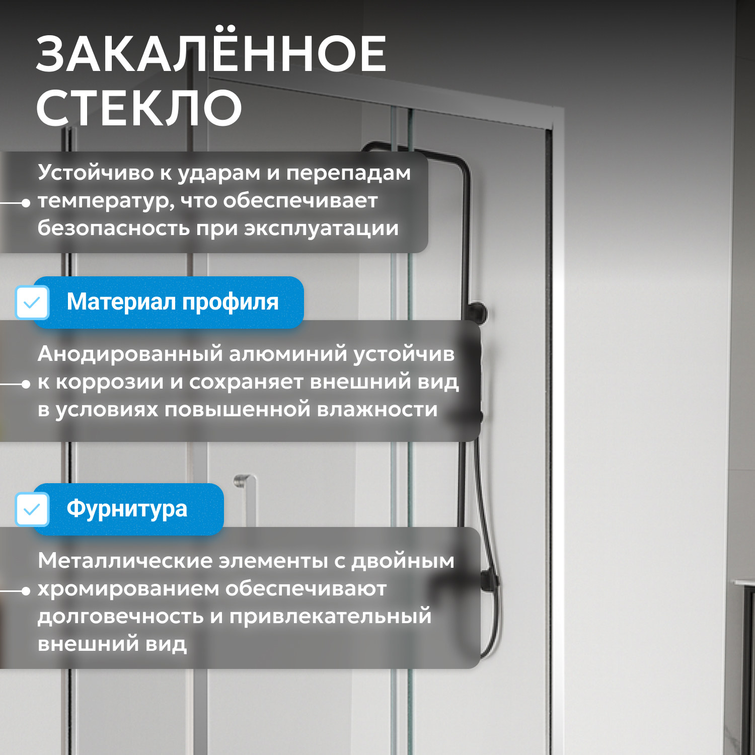 Прозрачное закалённое стекло толщиной 5 мм обеспечивает прочность и безопасность, а хромированный профиль придаёт лаконичный внешний вид, органично сочетающийся с другими сантехническими элементами. Высота конструкции — 190 см, ширина — 70 см, длина — 120 см, что подходит для большинства типовых и компактных санузлов.