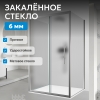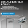 Изготовлен из матового стекла толщиной 6 мм, профиль — хромированный. Одна раздвижная дверь на двойных роликах открывается плавно и бесшумно, используют увеличенную металлическую ручку для удобства во влажных условиях. Ширина входа составляет 498 мм.