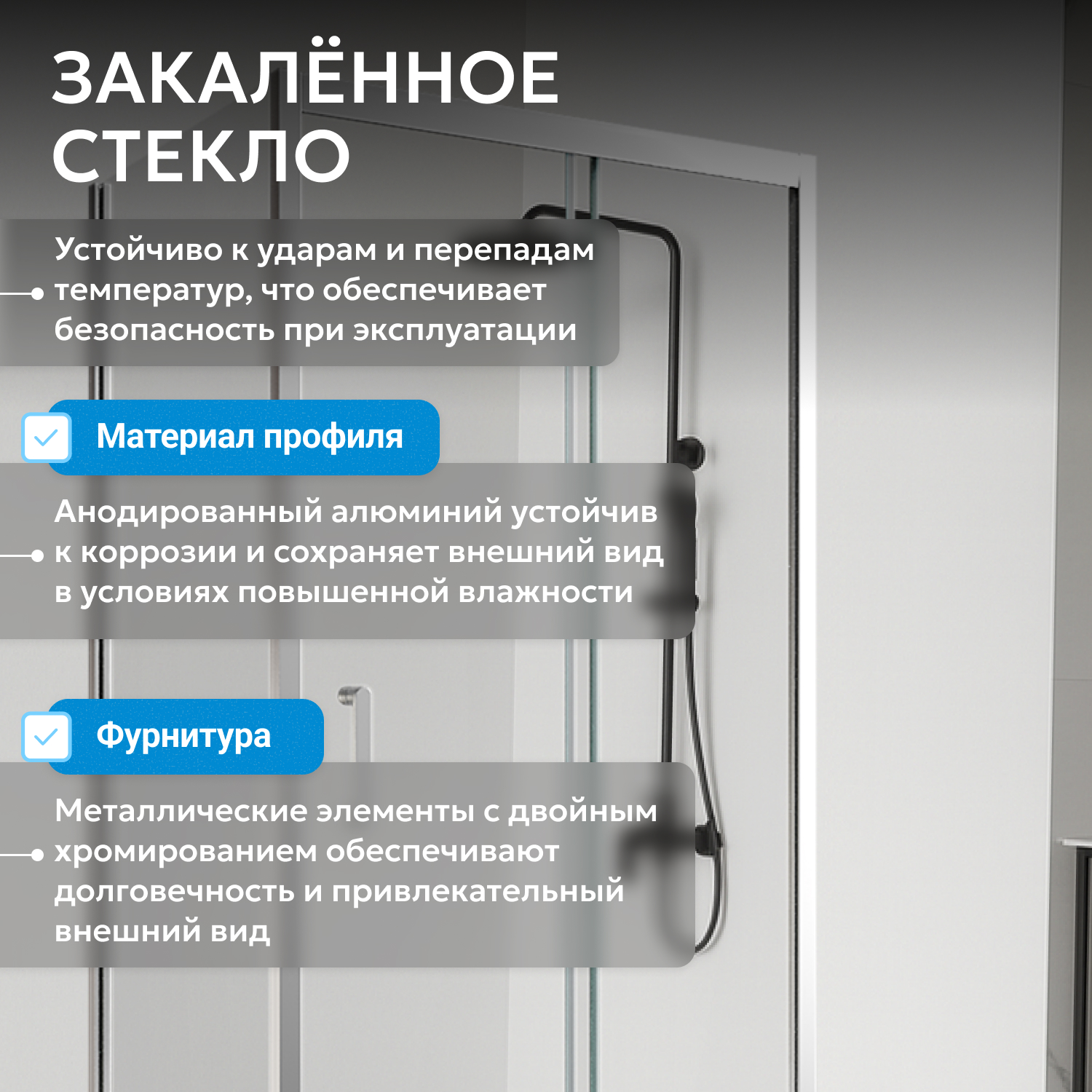 Использование закаленного стекла соответствует европейским стандартам безопасности. Профиль цвета хром устойчив к износу и легко очищается. Гарантия — 3 года.