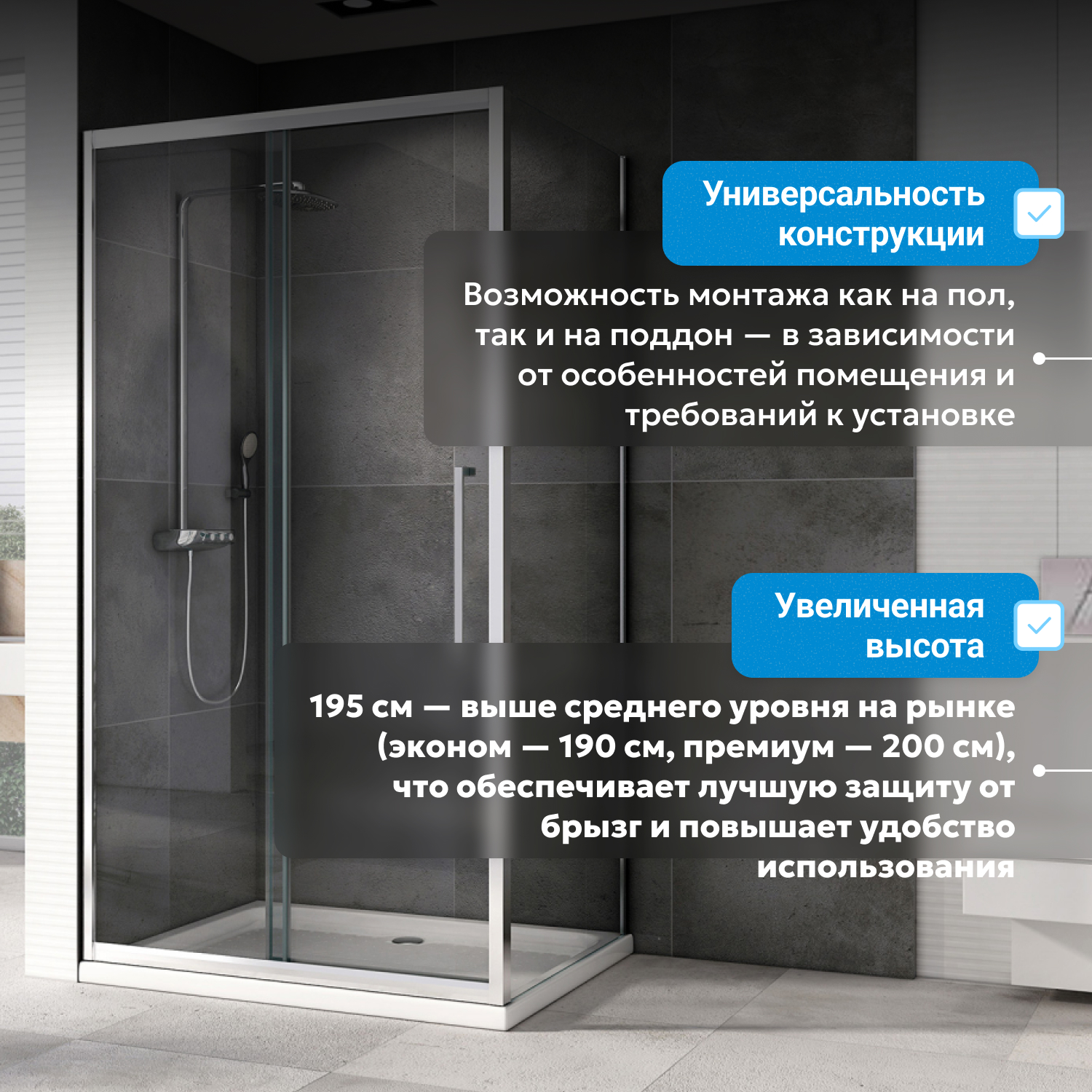 Конструкция и комплектация способствуют ускоренному монтажу. Все элементы адаптированы под российские стандарты водоснабжения, уголок подходит для самостоятельной или профессиональной установки. Прозрачное стекло легко очищается, материалы уменьшает необходимость частого ухода.