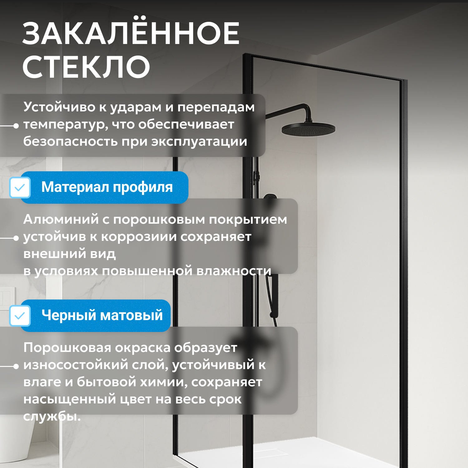 Профиль выполнен из прочного металла с чёрным покрытием, защищён от коррозии. Габариты 80×85 см при высоте 195 см подходят для современных ванных комнат. Сочетание прозрачного стекла, прямых линий и чёрной фурнитуры дополняет интерьеры разных стилей.