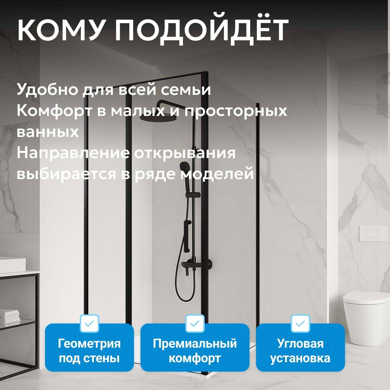 Маятниковая петля двери позволяет открывать ее внутрь и наружу, что удобно для компактных ванных комнат. Уголок подходит для правого или левого открывания и легко интегрируется в различные планировки. Установка не требует сложных механизмов и занимает минимальное время, металлическая ручка рассчитана на интенсивное ежедневное использование.