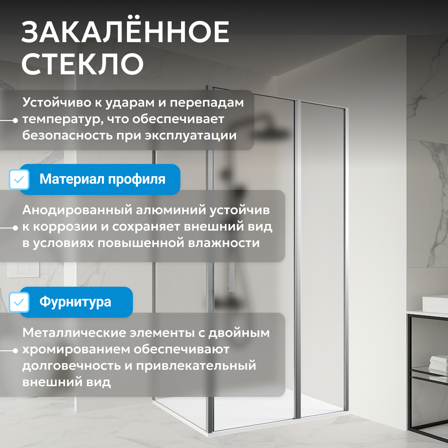 В конструкции используется матовое закаленное стекло толщиной 6 мм, устойчивое к механическим воздействиям. Профиль выполнен в хромированном цвете, металлическая ручка добавляет эргономичности. Вход шириной 604 мм обеспечивает удобный проход.