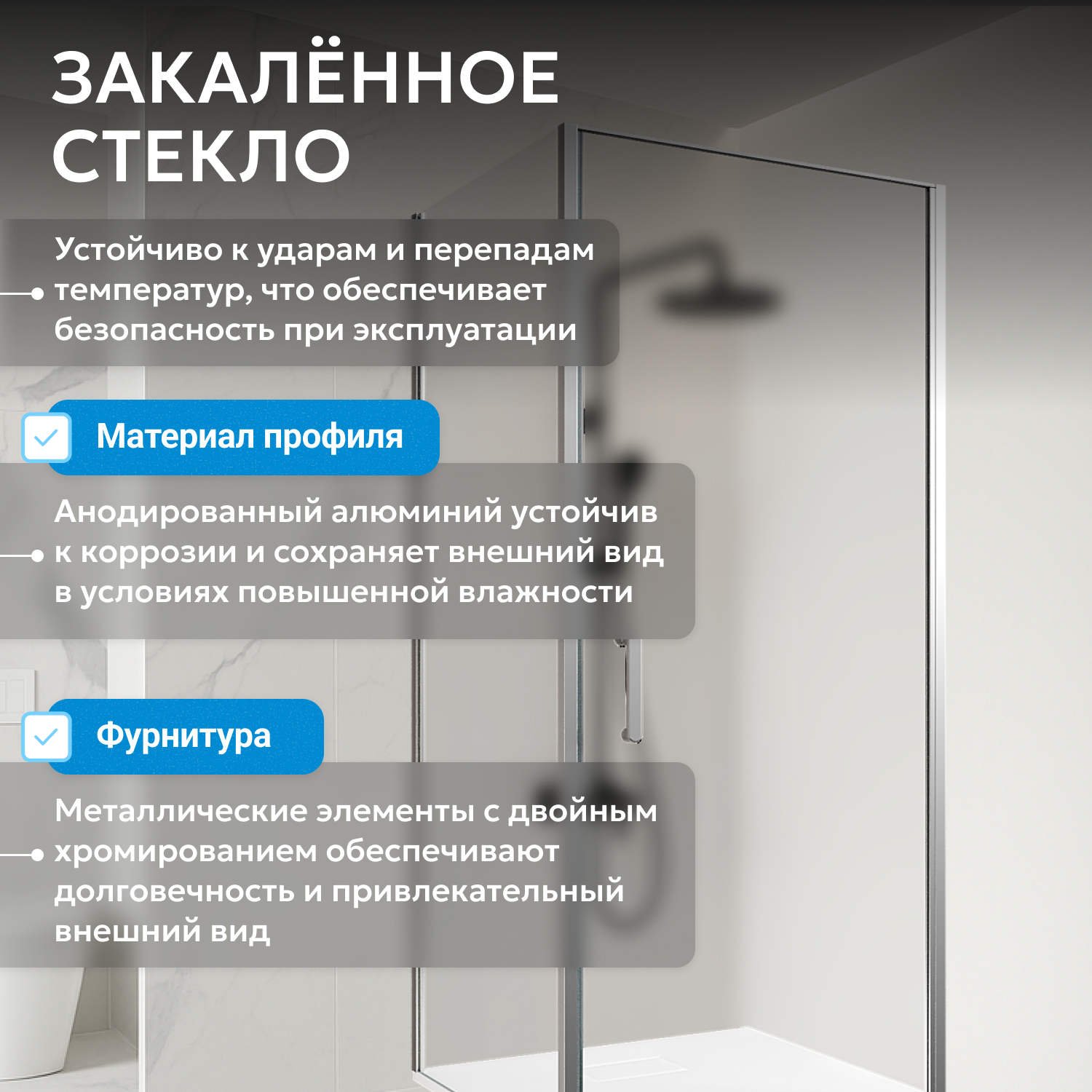 Размеры уголка: ширина 75 см, длина 80 см, высота 195 см. Вход 695 мм обеспечивает свободное перемещение, металлическая ручка повышает надёжность. Вес 50 кг способствует устойчивости конструкции. Поддон приобретается отдельно, что позволяет подобрать оптимальную комплектацию для санузла.