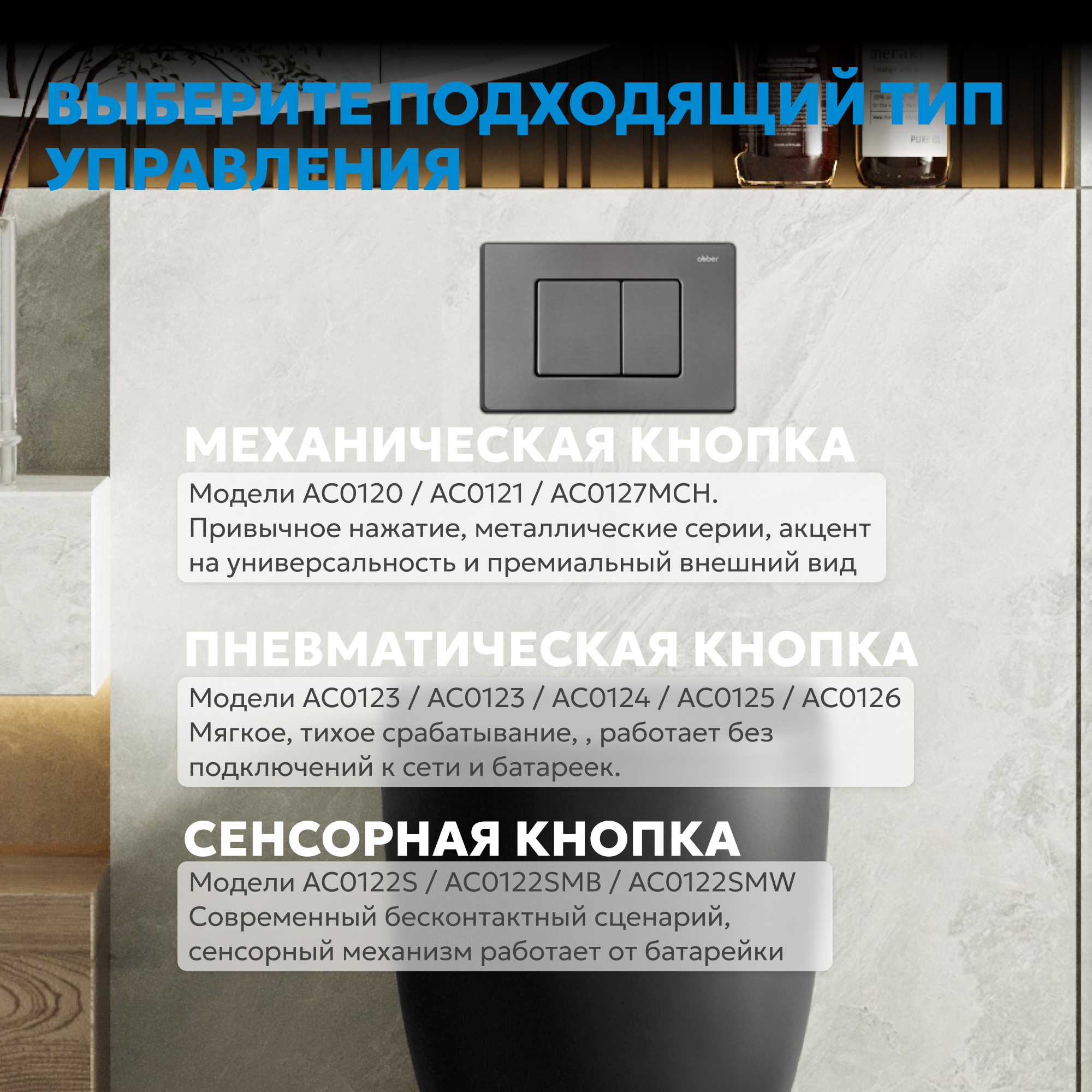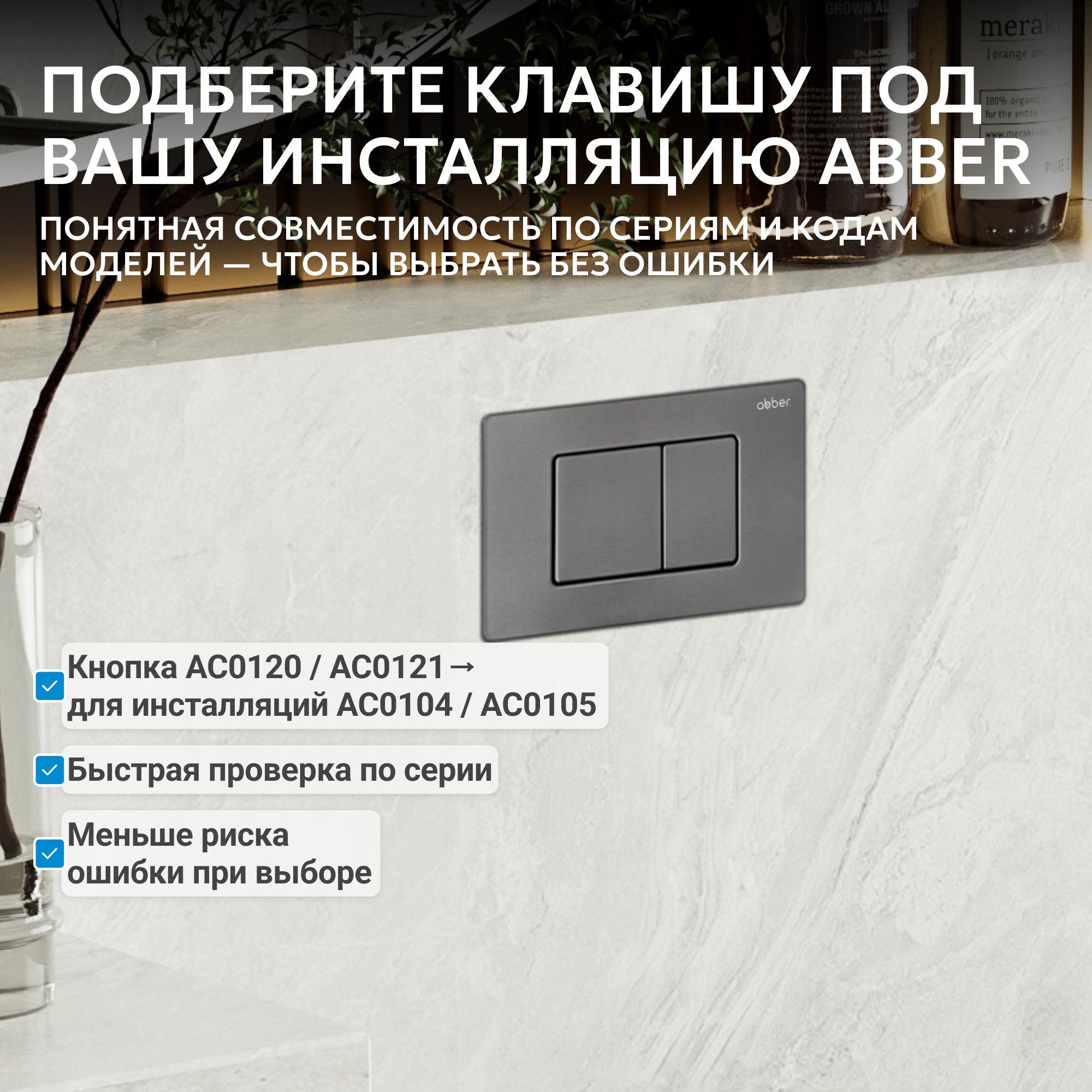 Преобразите санузел с помощью современного аксессуара — кнопка смыва ABBER гармонично впишется как в современные интерьеры.