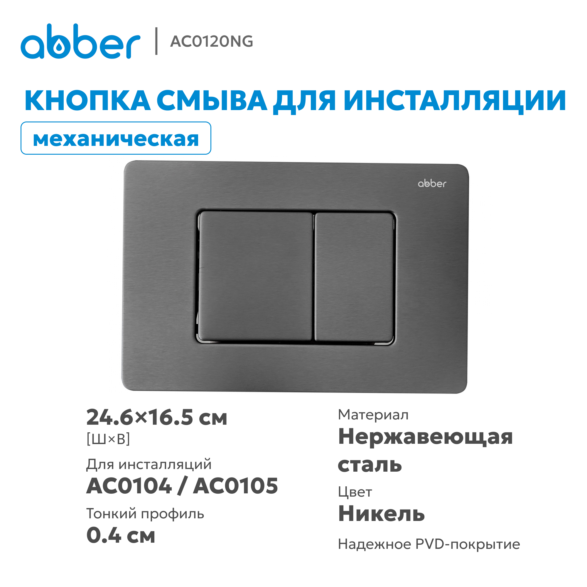 Стильная механическая кнопка смыва ABBER AC0120NG — элегантное решение для современного санузла. Покрытие «никель» придаёт изделию благородный металлический блеск и гармонично вписывается в интерьеры в стиле модерн, хай‑тек, лофт или современная классика.