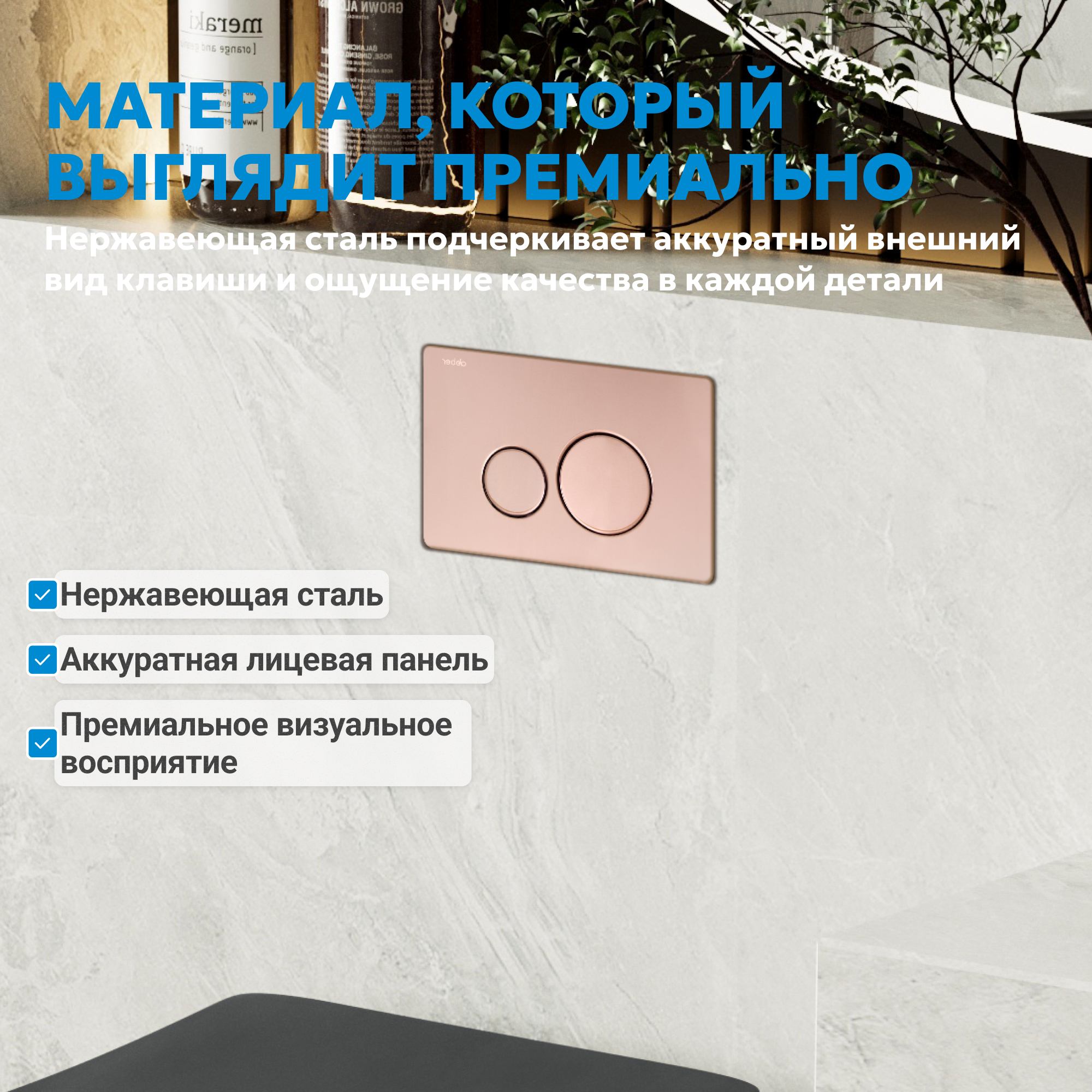 Элегантная кнопка смыва из нержавеющей стали в цвете розовое золото — стильное и функциональное дополнение к любой инсталляции ABBER с механическим смывом.