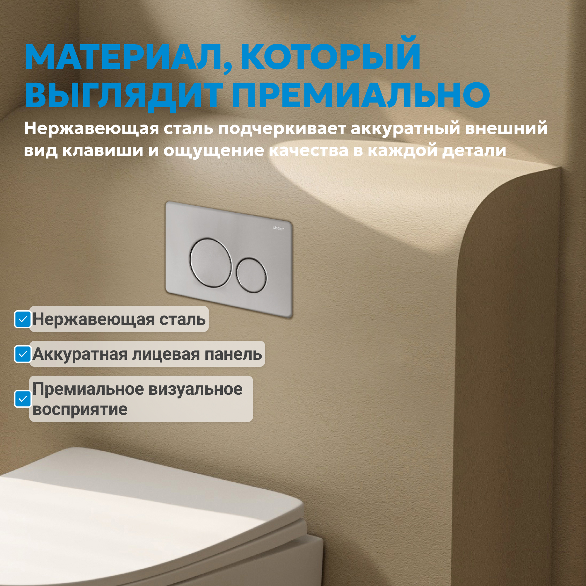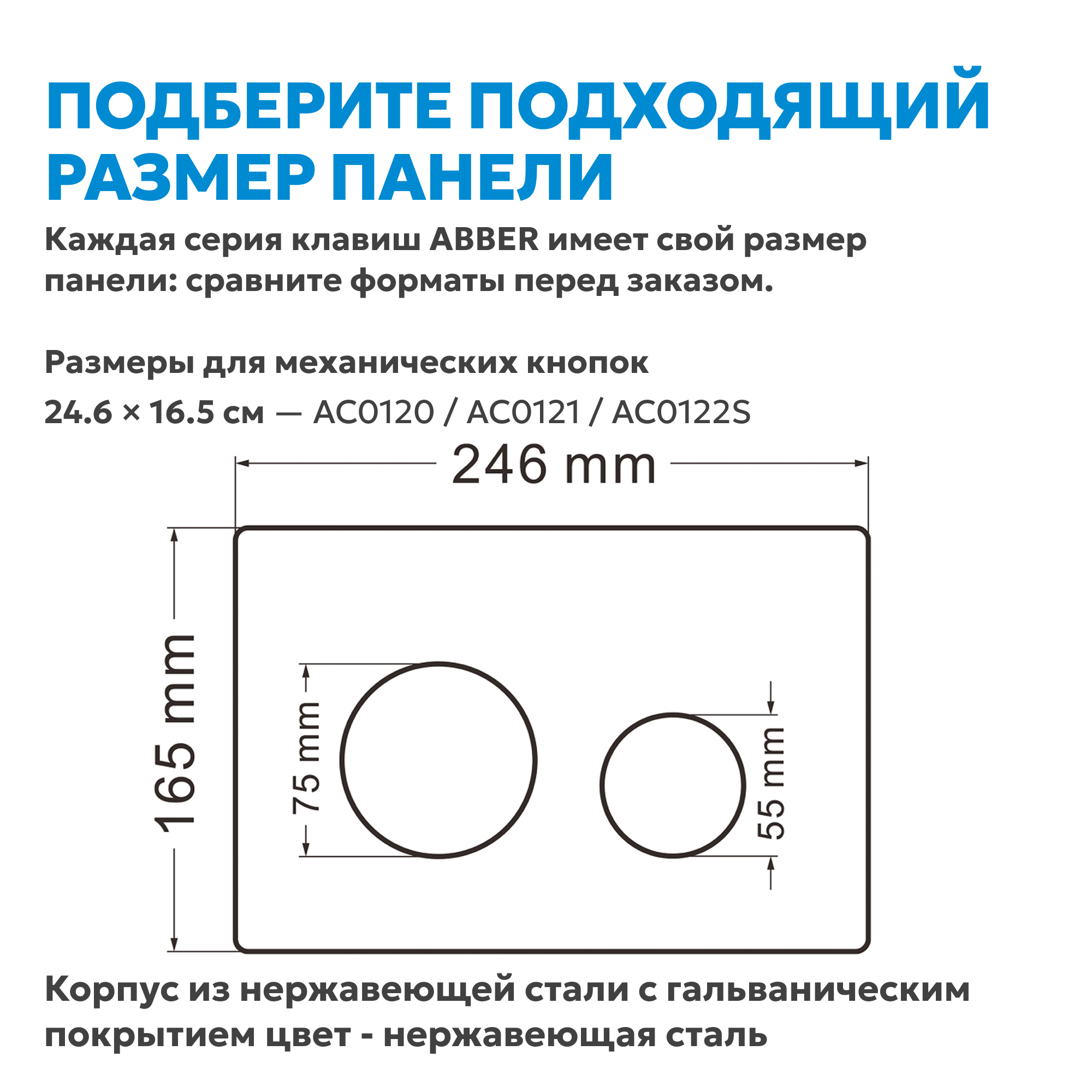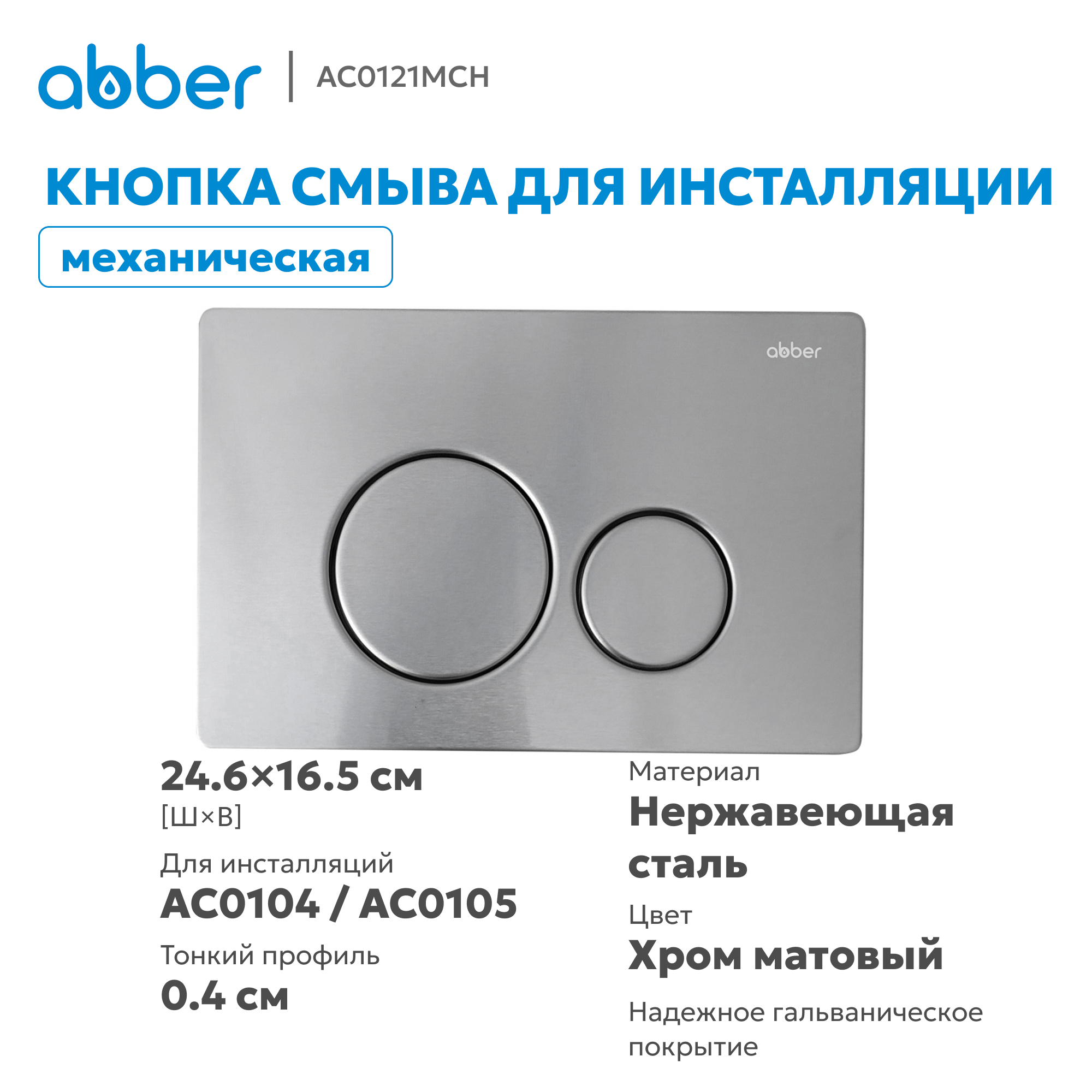 Элегантная кнопка смыва из нержавеющей стали в матовом хромированном исполнении — стильное и функциональное дополнение к любой инсталляции ABBER с механическим смывом.