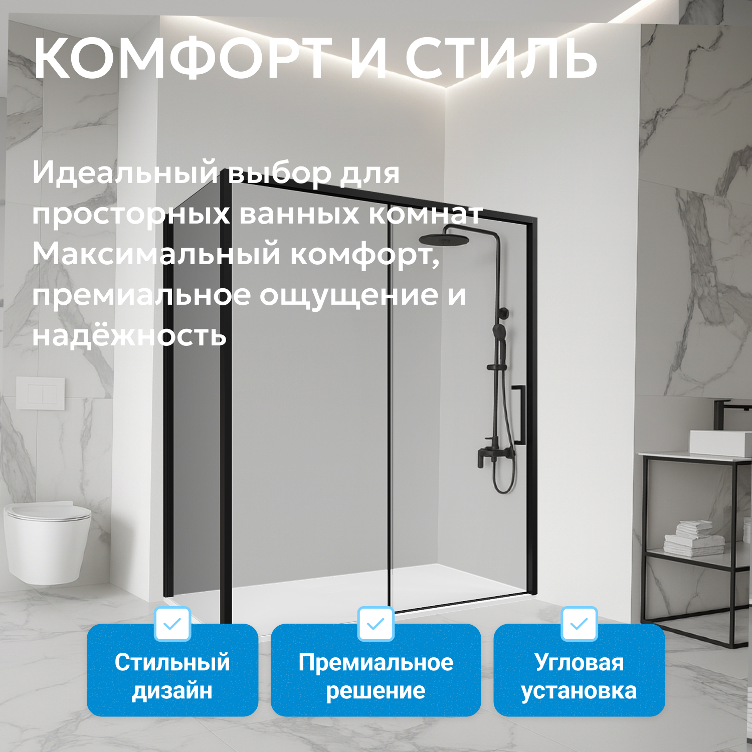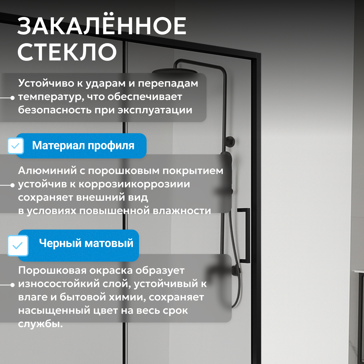 В конструкции реализовано водоотталкивающее покрытие для облегчения ухода и уменьшения налета. Доводчики Soft-close обеспечивают плавное и бесшумное закрывание двери, увеличивая срок службы изделия. Пристенный профиль шириной 60 мм гарантирует надежную фиксацию всей конструкции.