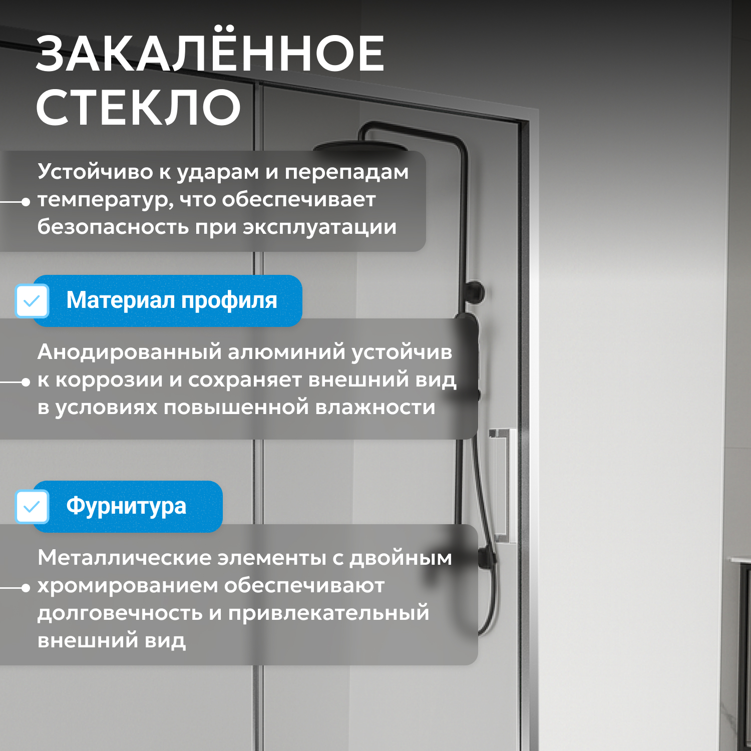 Хромированный профиль устойчив к влаге и коррозии, обеспечивая надёжность конструкции и аккуратный внешний вид. Пристенные профили шириной 60 мм гарантируют прочное крепление стеклянных панелей и герметичность соединений.