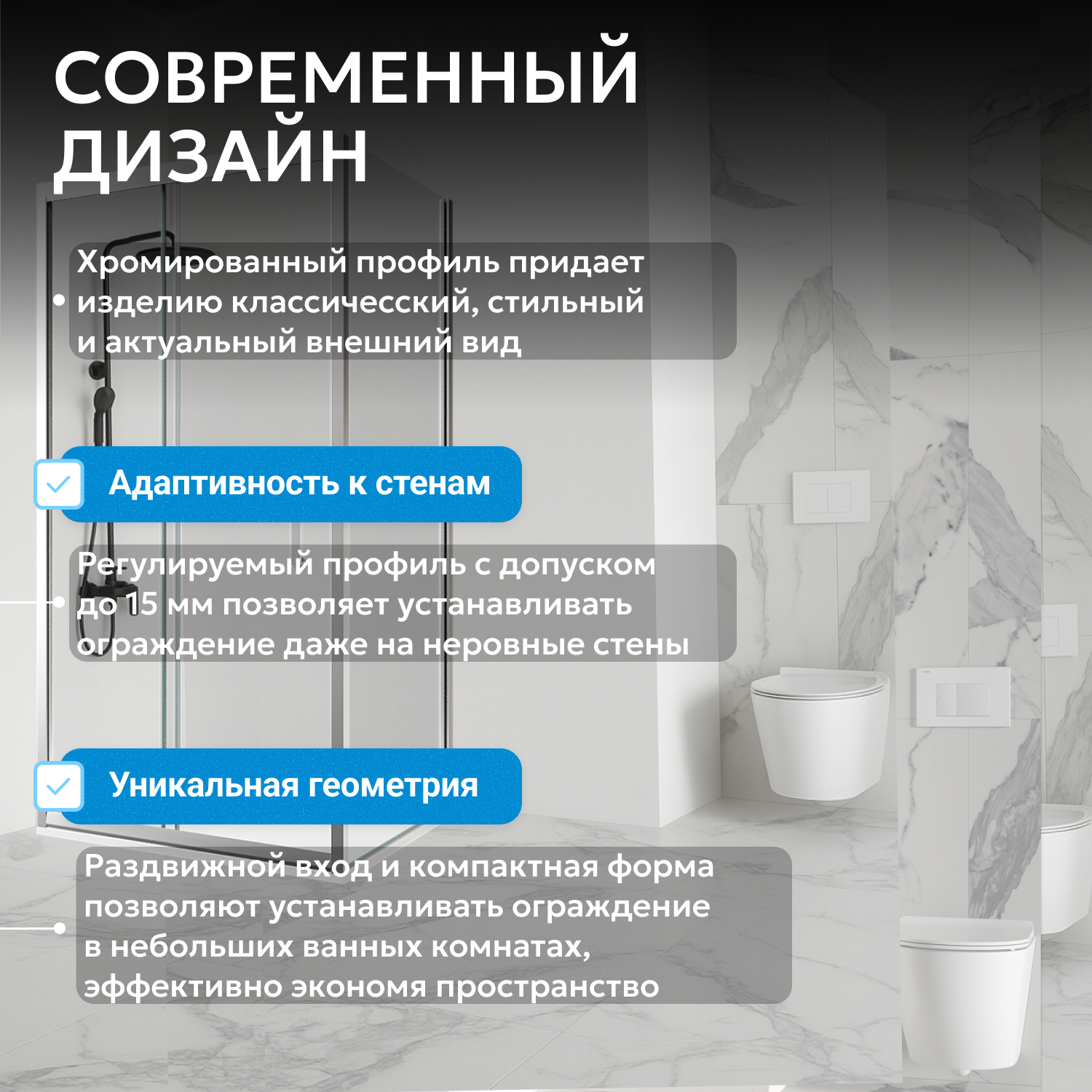 Душевой уголок ABBER Schwarzer Diamant AG301505-S605 подходит для ванных комнат с ограниченным пространством. Прямоугольная форма и монтаж в угол обеспечивают рациональное использование площади и удобство зонирования. Конструкция выполнена из прозрачного закалённого стекла толщиной 5 мм, что визуально расширяет помещение, а хромированный профиль подчёркивает современный стиль. Раздвижная дверь не требует дополнительного пространства для открытия, а двойные ролики на направляющих гарантируют плавное движение. Эргономичная пластиковая ручка проста в уходе. Высота изделия — 190 см, ширина входа — 644 мм, порог низкий для комфортного входа и выхода.