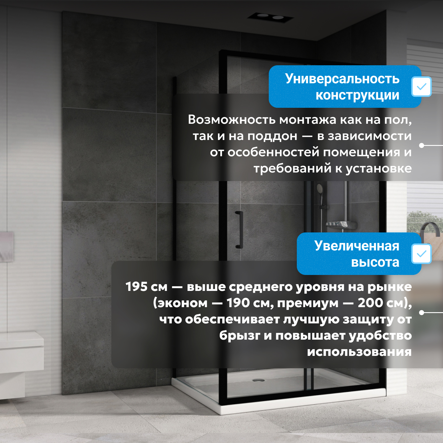 Профиль черного цвета и лаконичный дизайн позволяют гармонично вписать душевой уголок в современный интерьер. Пластиковая ручка и двойные ролики обеспечивают плавное открытие двери без доводчиков, что увеличивает срок службы механизма. Конструкция рассчитана на установку в угол, а поддон в комплект не входит, что дает возможность выбрать подходящий вариант среди низких моделей.
