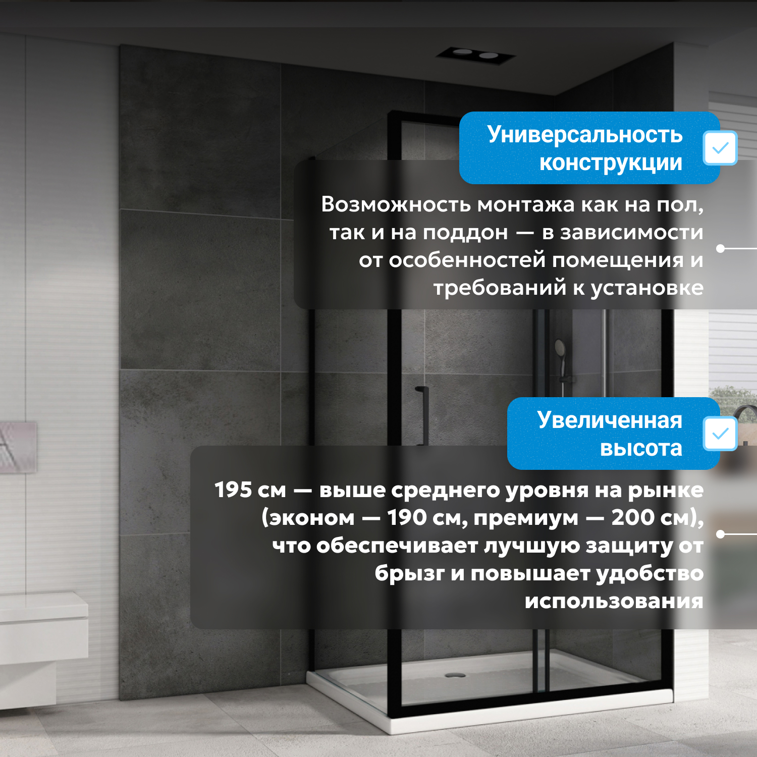 Минималистичный дизайн подчеркнут чёрным алюминиевым профилем. Высота 190 см обеспечивает комфорт для пользователей разного роста. Универсальная конструкция позволяет выбрать подходящий низкий поддон, который не входит в комплект.