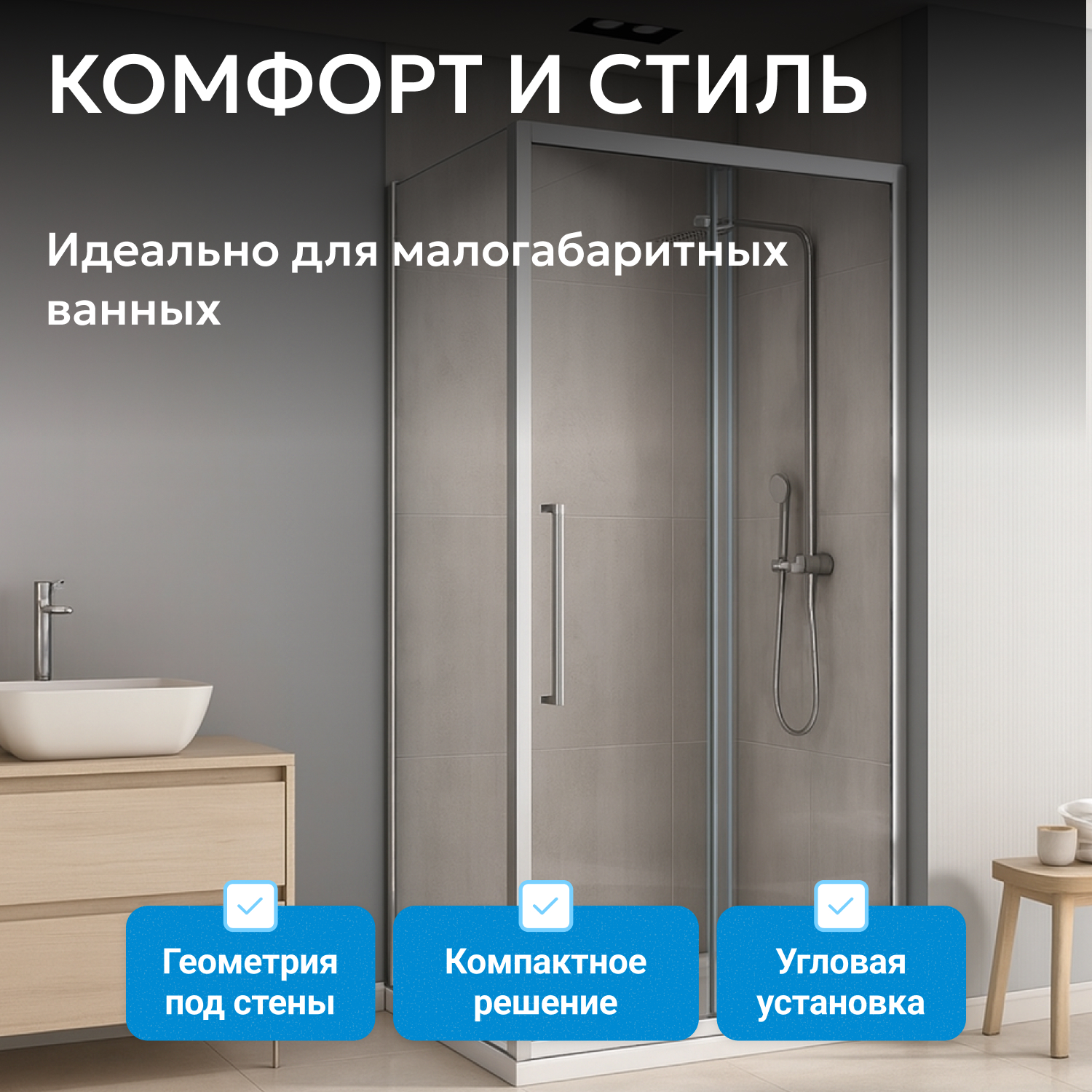 Раздвижная дверь с двойными роликами обеспечивает плавное и бесшумное открывание, устойчива к износу. Конструкция устанавливается в угол, что экономит пространство в небольшой ванной. Поддон можно выбрать отдельно, исходя из предпочтений по высоте.