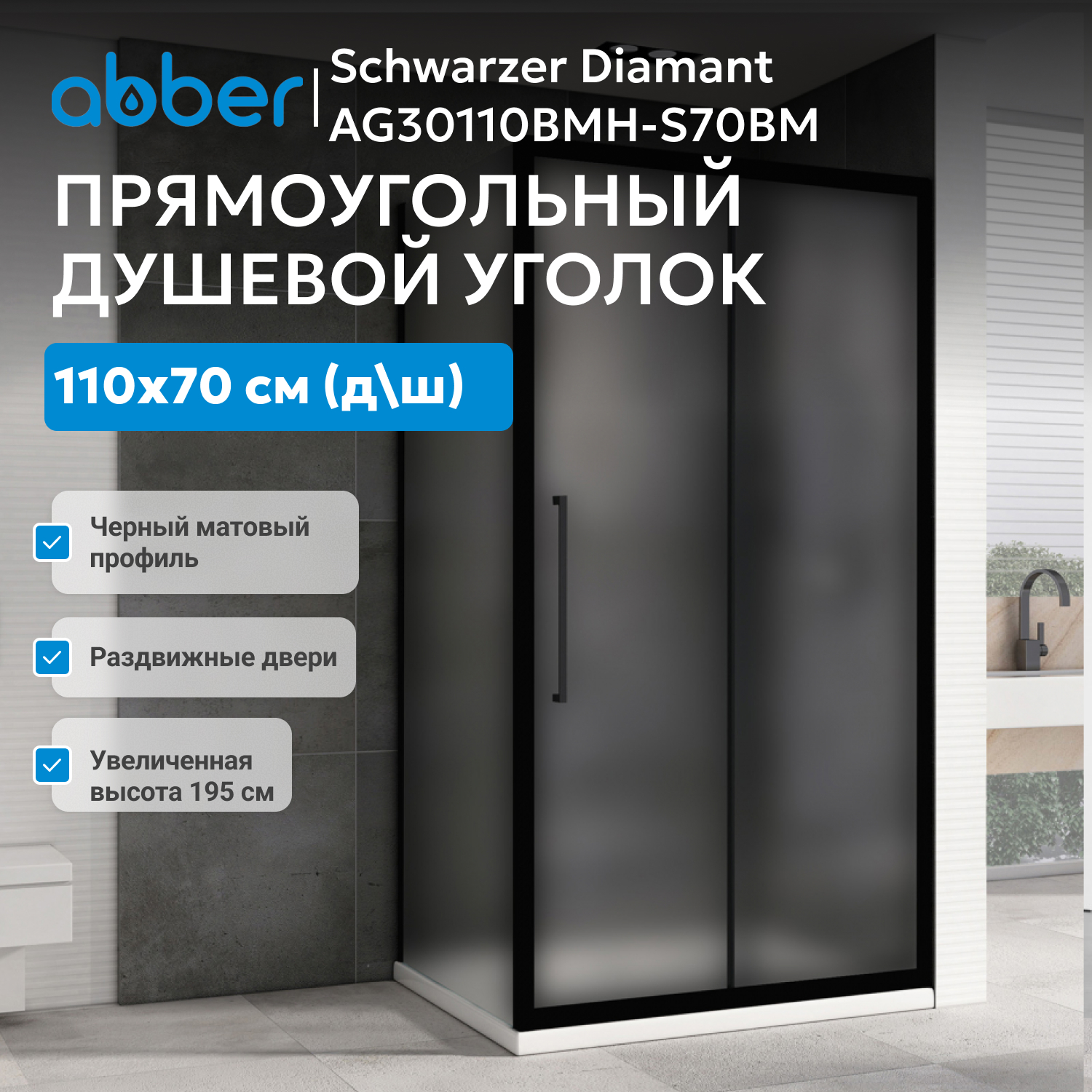 Душевой уголок ABBER Schwarzer Diamant AG30110BMH-S70BM предназначен для эффективного использования пространства в ванных комнатах с любой планировкой. Прямоугольная форма (110×70 см) и вход шириной 448 мм делают ежедневные процедуры удобными, а матовое стекло 6 мм — приватными и визуально лёгкими.