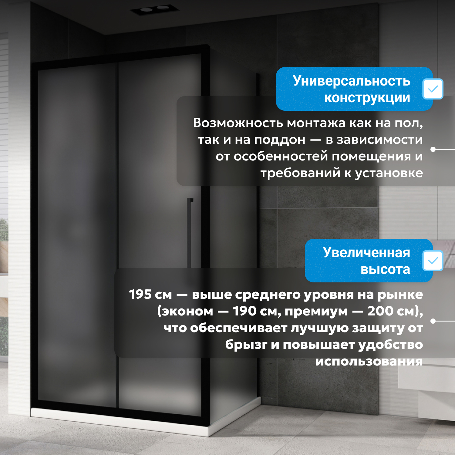 Продукция проходит контроль качества на всех этапах и соответствует современным требованиям к сантехническому ремонту и монтажу. Возможен выбор подходящего по размеру поддона к конструкции.
