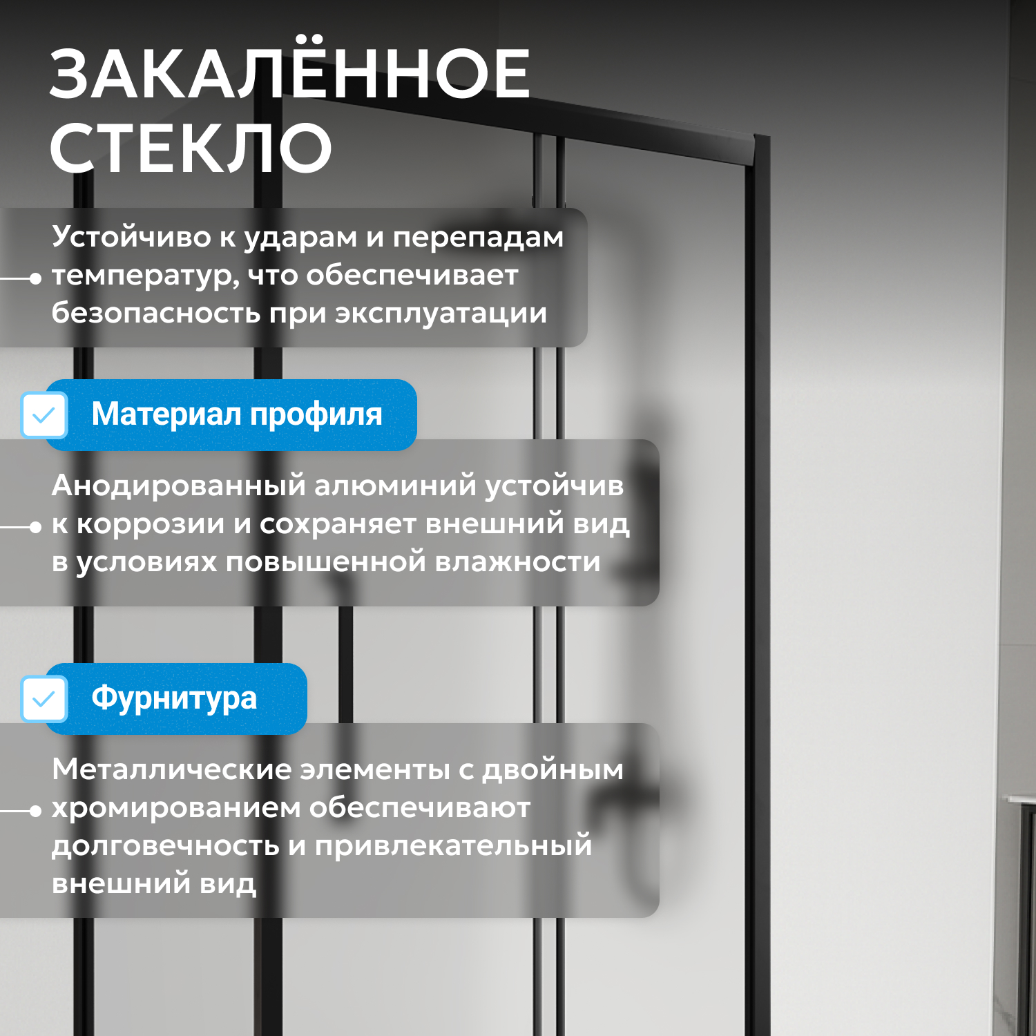 Ширина входа 698 мм обеспечивает удобство использования. Матовое стекло создает приватность. Надежный механизм без доводчиков, отсутствие водоотталкивающего покрытия позволяют своевременно обслуживать изделие для сохранения эксплуатационных качеств.