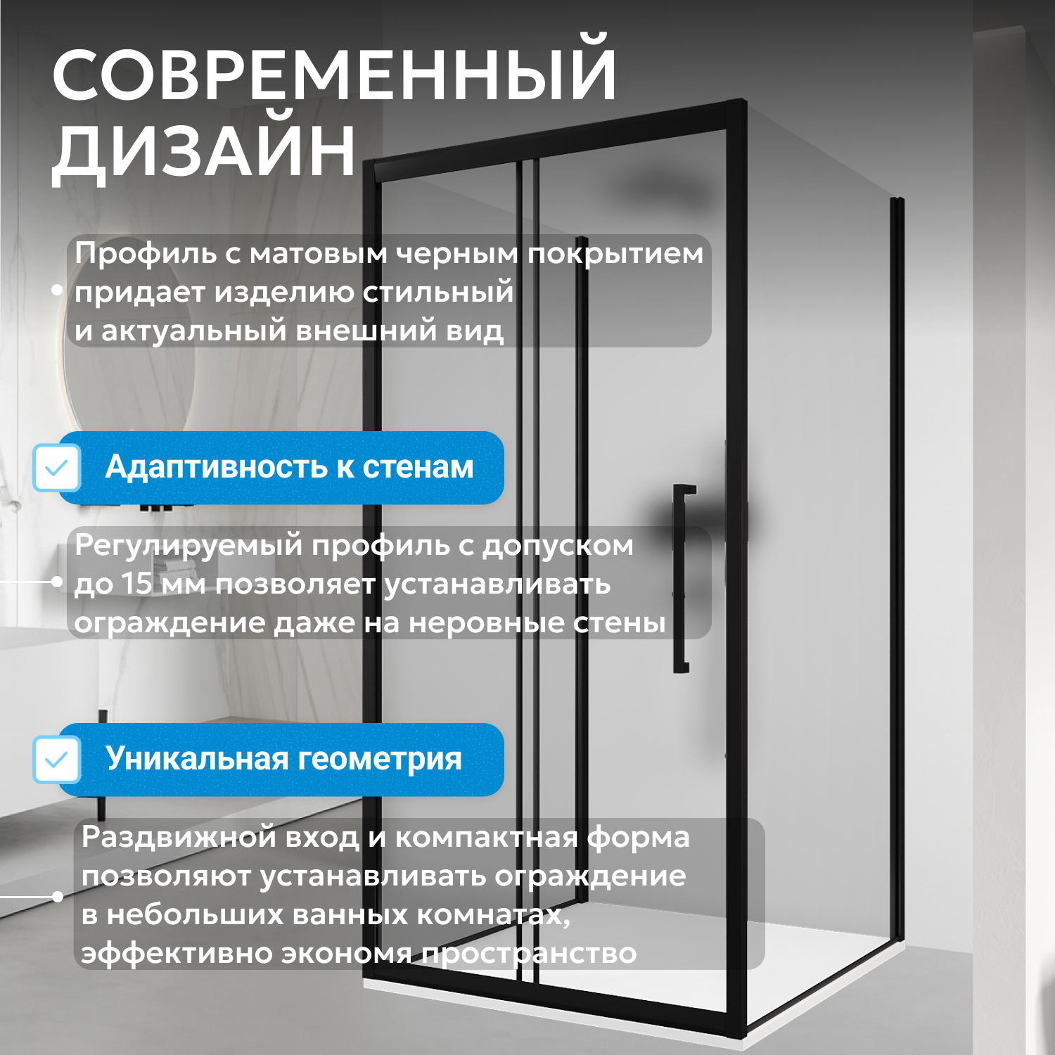 Корпус выполнен из матового стекла толщиной 6 мм, что обеспечивает прочность и приватность. Надежные металлические элементы и черный профиль органично дополняют немецкий дизайн коллекции Schwarzer Diamant. Раздвижная дверь с одним полотном и двойными роликами гарантирует плавное открытие и долговечность механизма.
