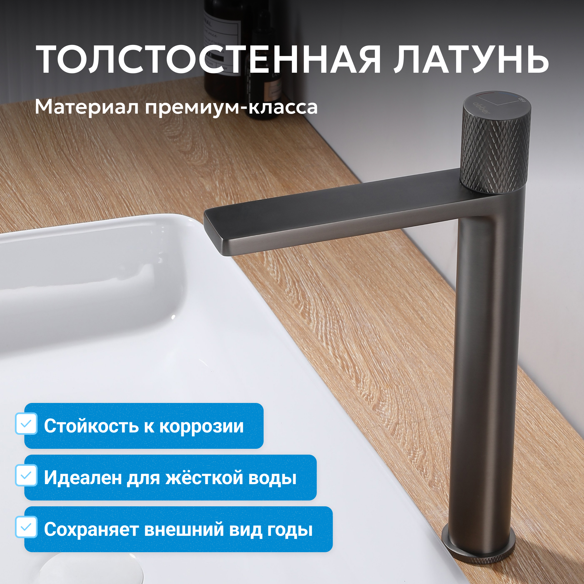 Корпус всех смесителей ABBER изготавливается из латуни техникой цельной отливки при атмосферном давлении, что обеспечивает высокую прочность изделия и устойчивость к перепадам давления.