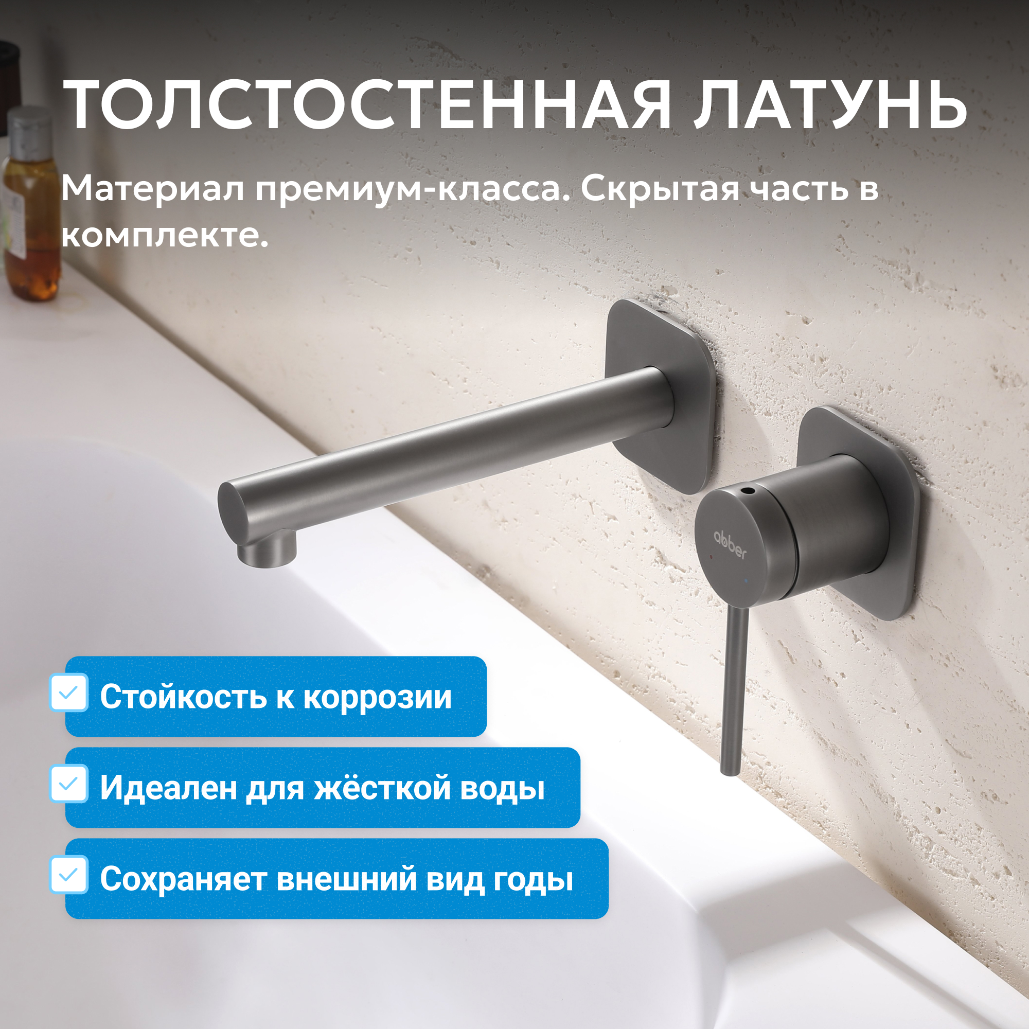 Корпус всех смесителей ABBER изготавливается из латуни техникой цельной отливки при атмосферном давлении, что обеспечивает высокую прочность изделия и устойчивость к перепадам давления.