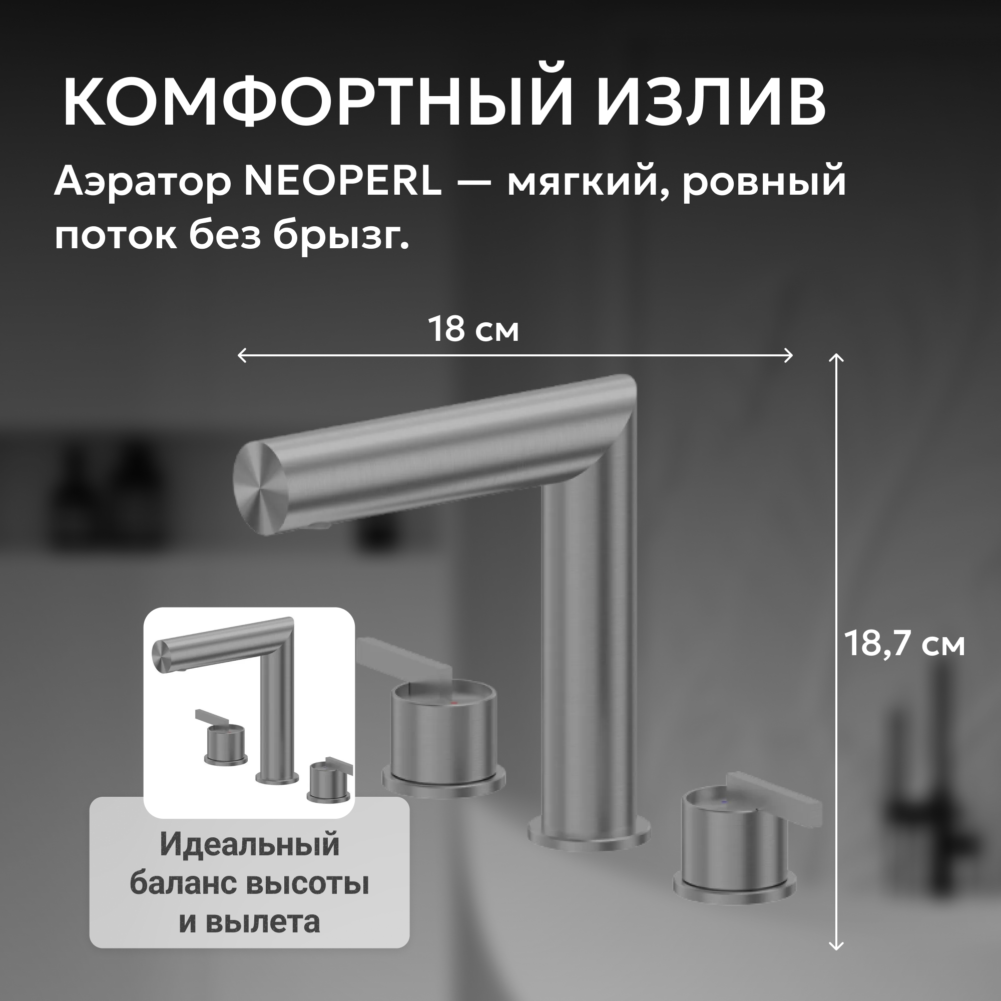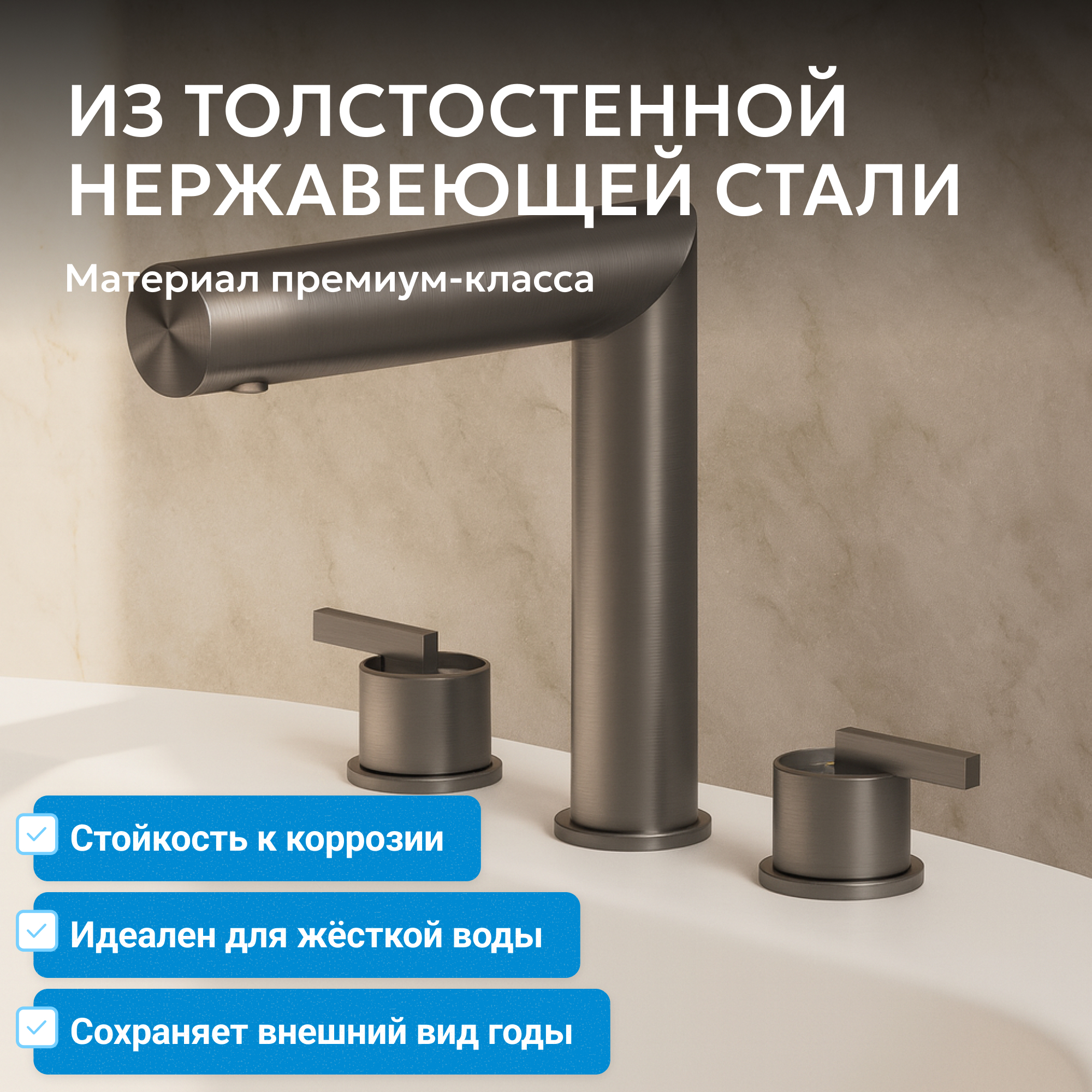 Смеситель в цвете Оружейная сталь брашированная с 5-слойным PVD покрытием. Данное покрытие обеспечивает приятный внешний вид и длительный срок эксплуатации.