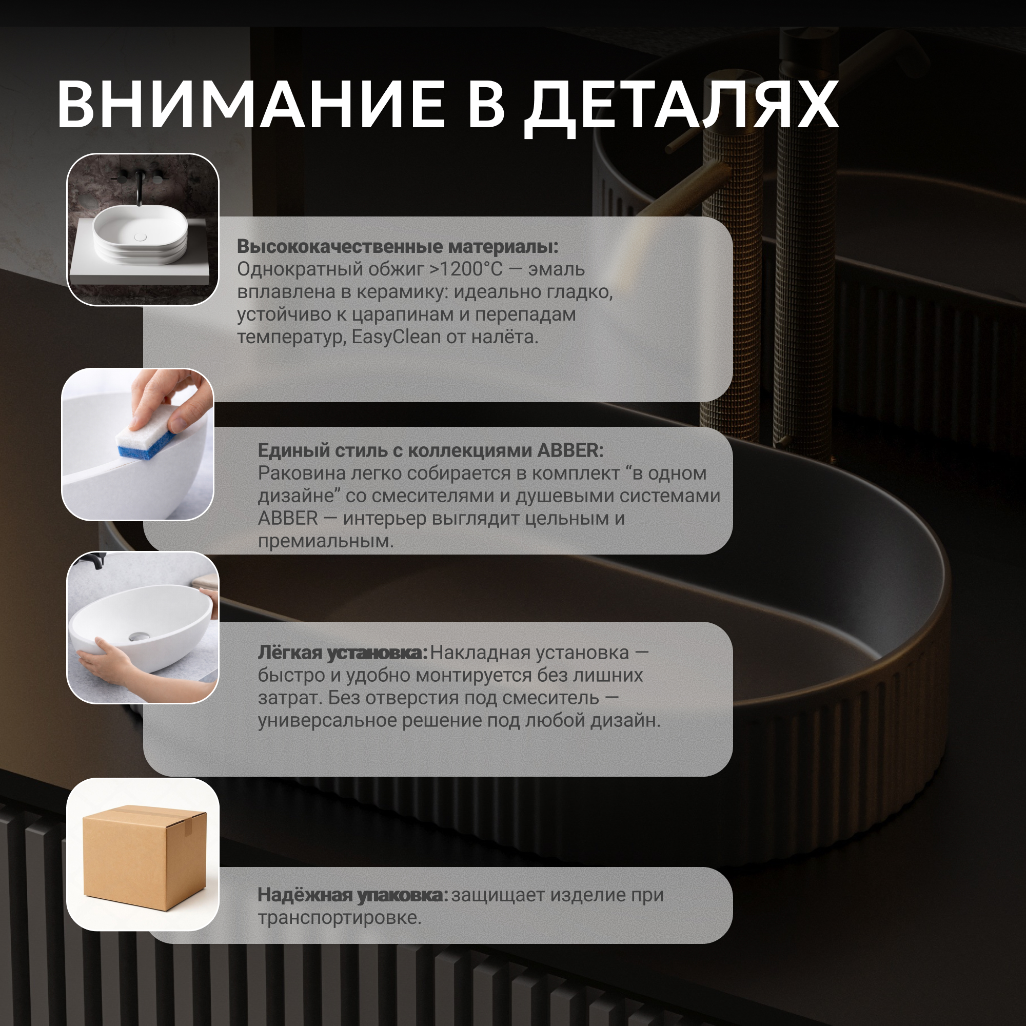 - накладные раковины ABBER можно установить на столешницу, тумбу, консоль
