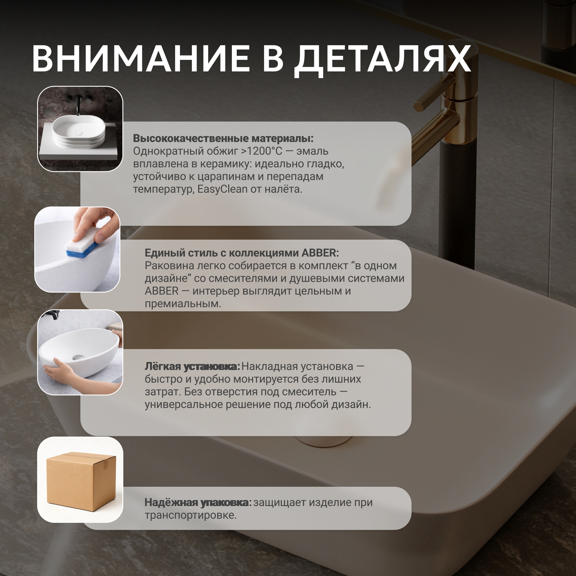 - накладные раковины ABBER можно установить на столешницу, тумбу, консоль