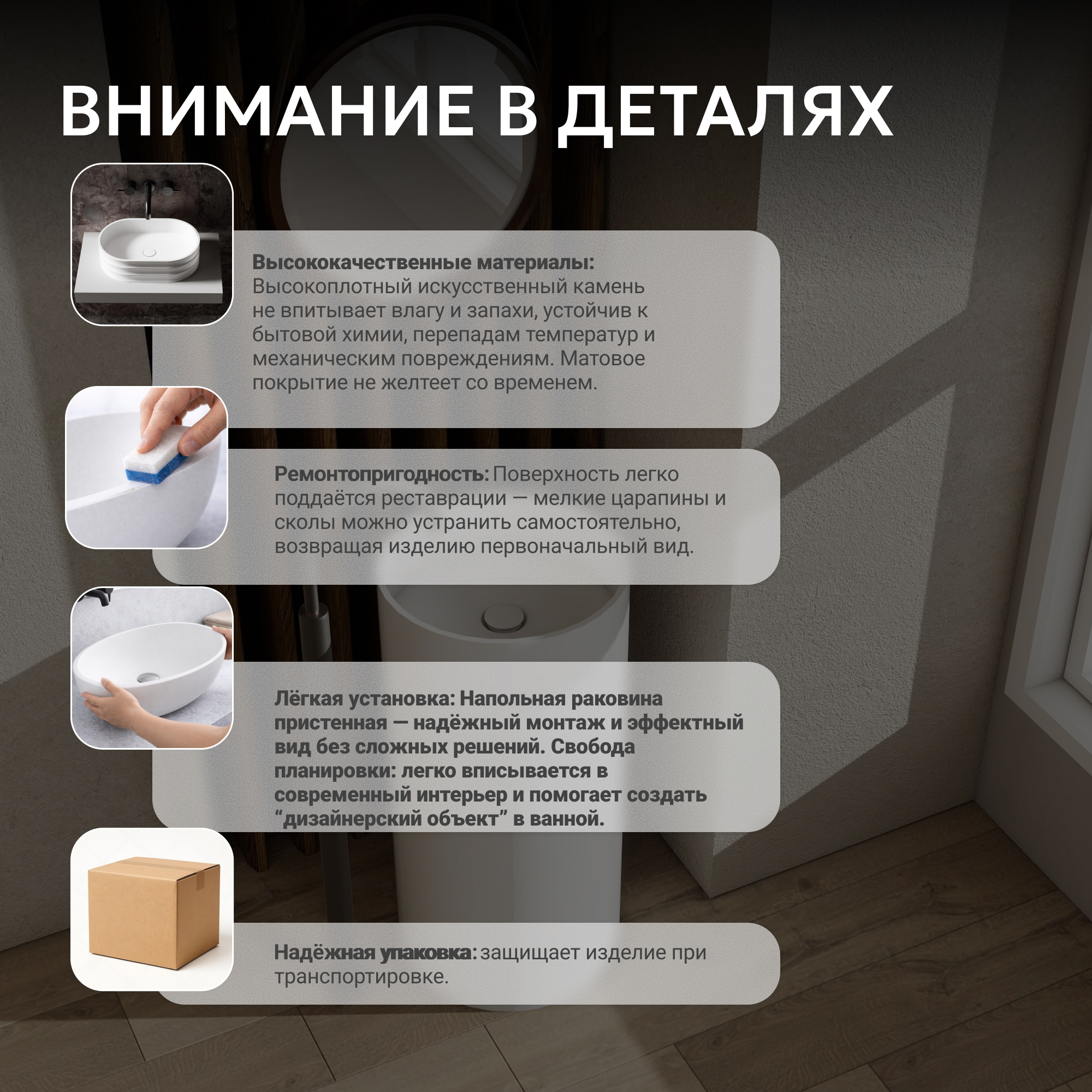 Изделия из искусственного камня ABBER Stein обладают высокой прочностью и устойчивостью к механическим повреждениям, а также не подвержены коррозии и влиянию агрессивных сред. Благодаря этому, они сохраняют свой первоначальный вид на протяжении многих лет и не требуют специального ухода.