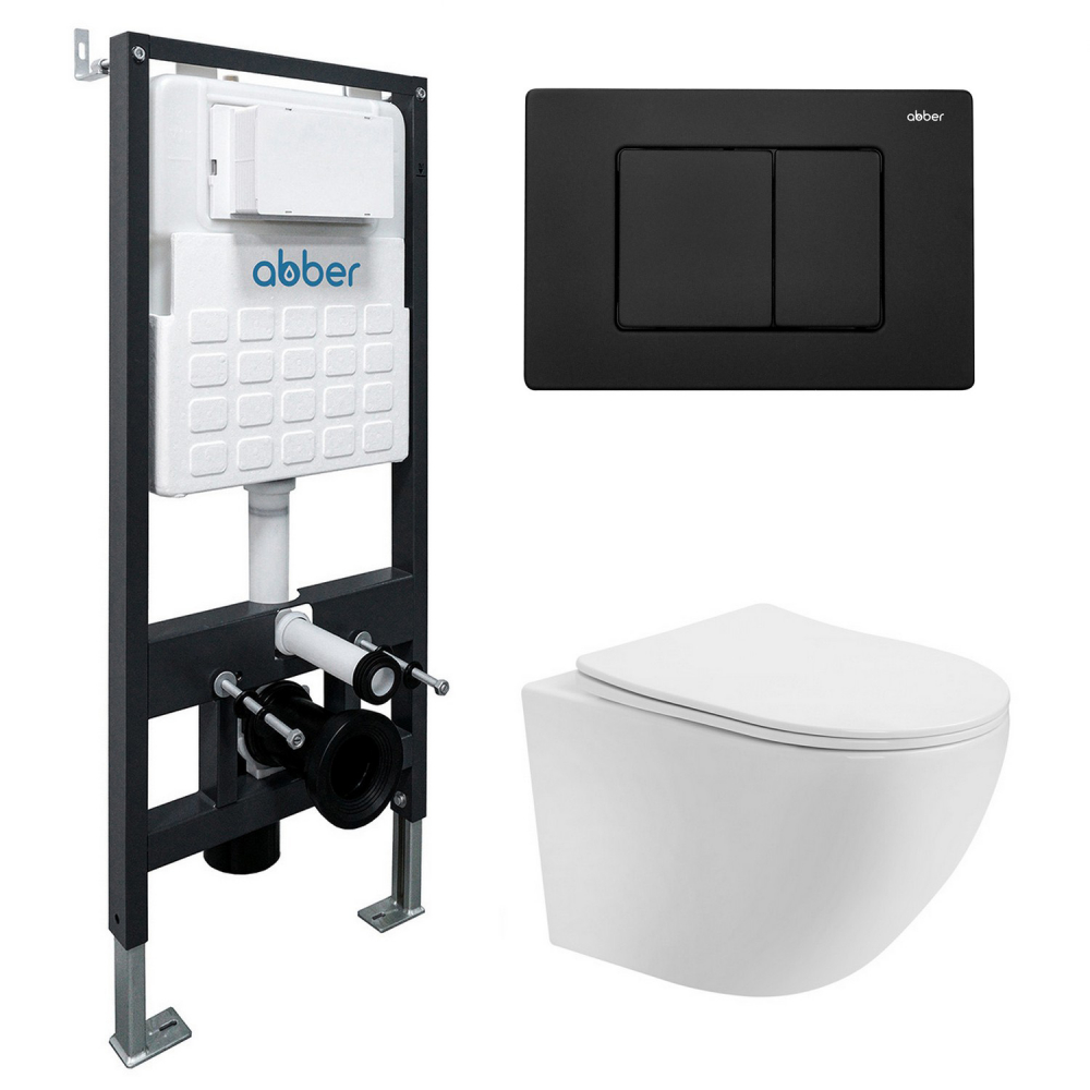 Комплекты: унитаз + инсталляция / Комплект подвесной унитаз ABBER Bequem AC1100T белый с инсталляцией AC0105 и кнопкой AC0120MB черный матовый