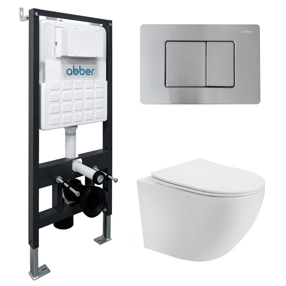 Комплекты: унитаз + инсталляция / Комплект подвесной унитаз ABBER Bequem AC1100T белый с инсталляцией AC0105 и кнопкой AC0120MCH матовый хром