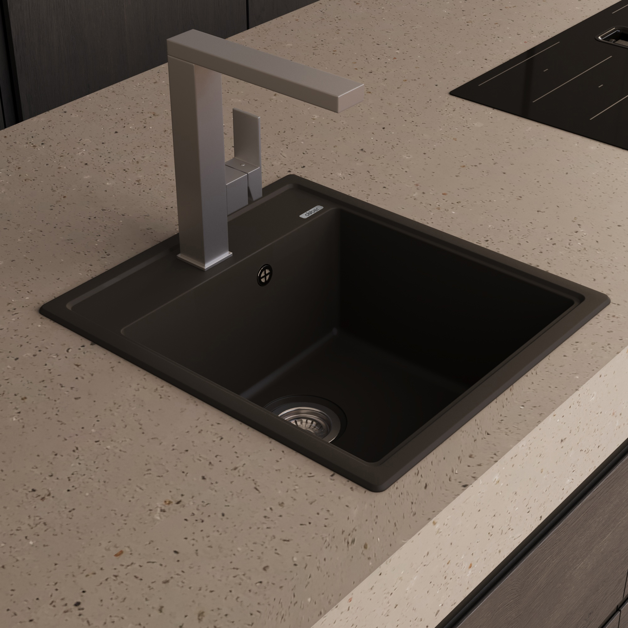 Кухонные мойки ABBER из кварцевого композита — это долговечность, надежность и простота в уходе. Черная кварцевая мойка 46х51х21,7см легко подойдет к любому дизайну кухни. Вы можете выбрать мойку с крылом или без. Чтобы очистить мойку, не нужно использовать какие-то специализированные средства. Кварцевая мойка не боится повреждений, не окрашиваются продуктами. Как натуральный камень, но лучше и дешевле!